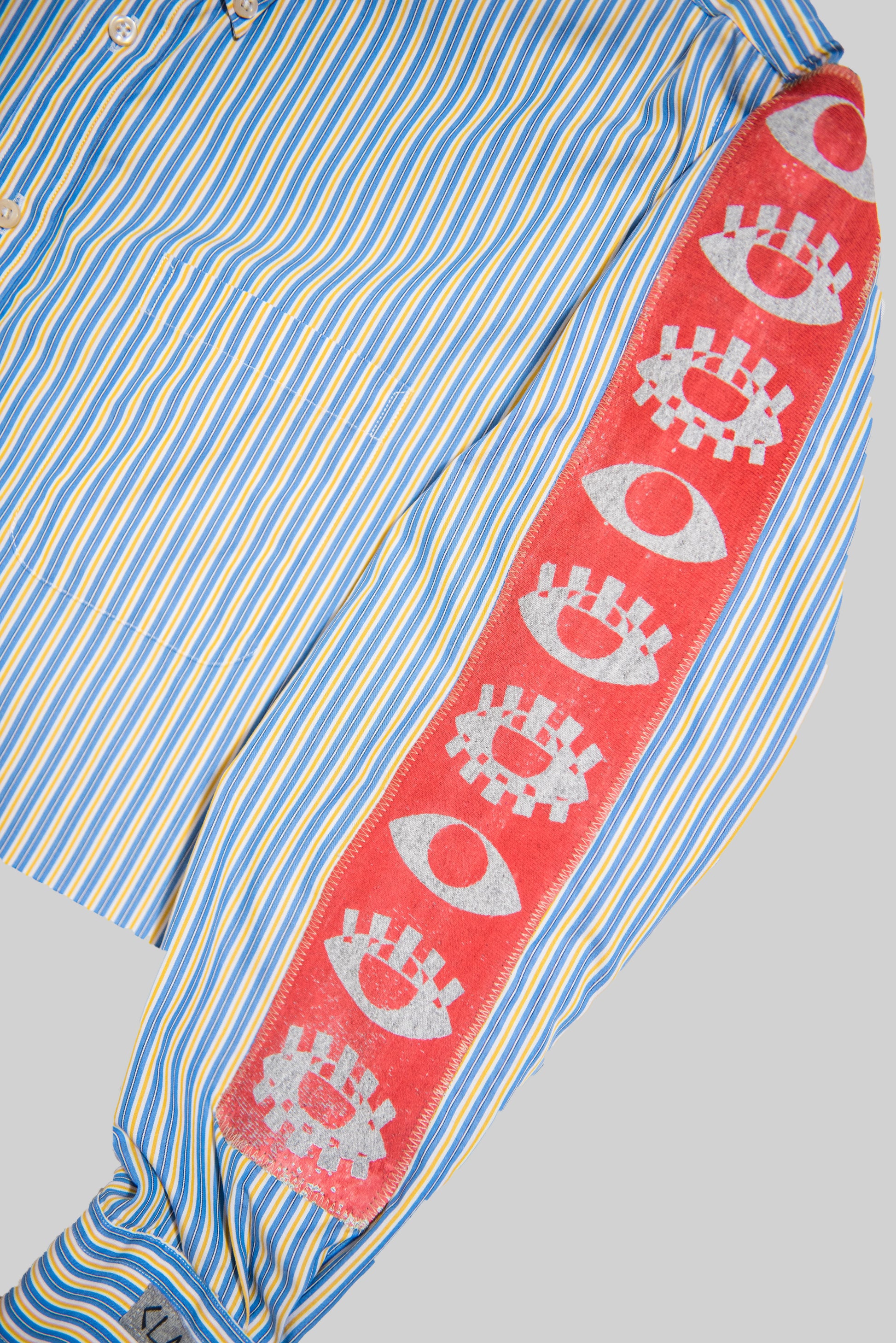 - Brand new condition cropped blue, yellow, white pin striped button-up dress shirt