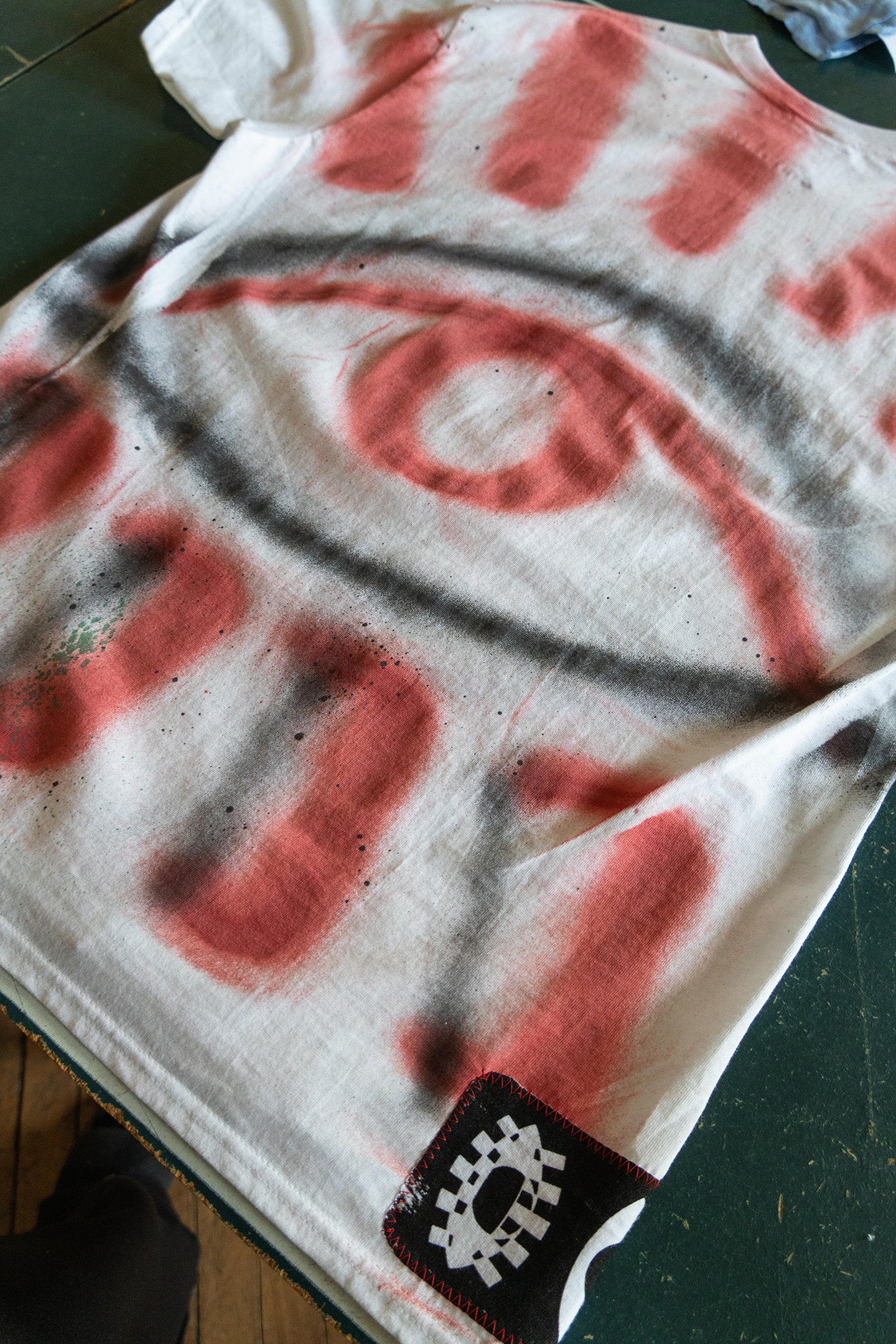 fabric spray paint remnants on shirt - they are not stains. this shirt is deadstock (brand new condition)