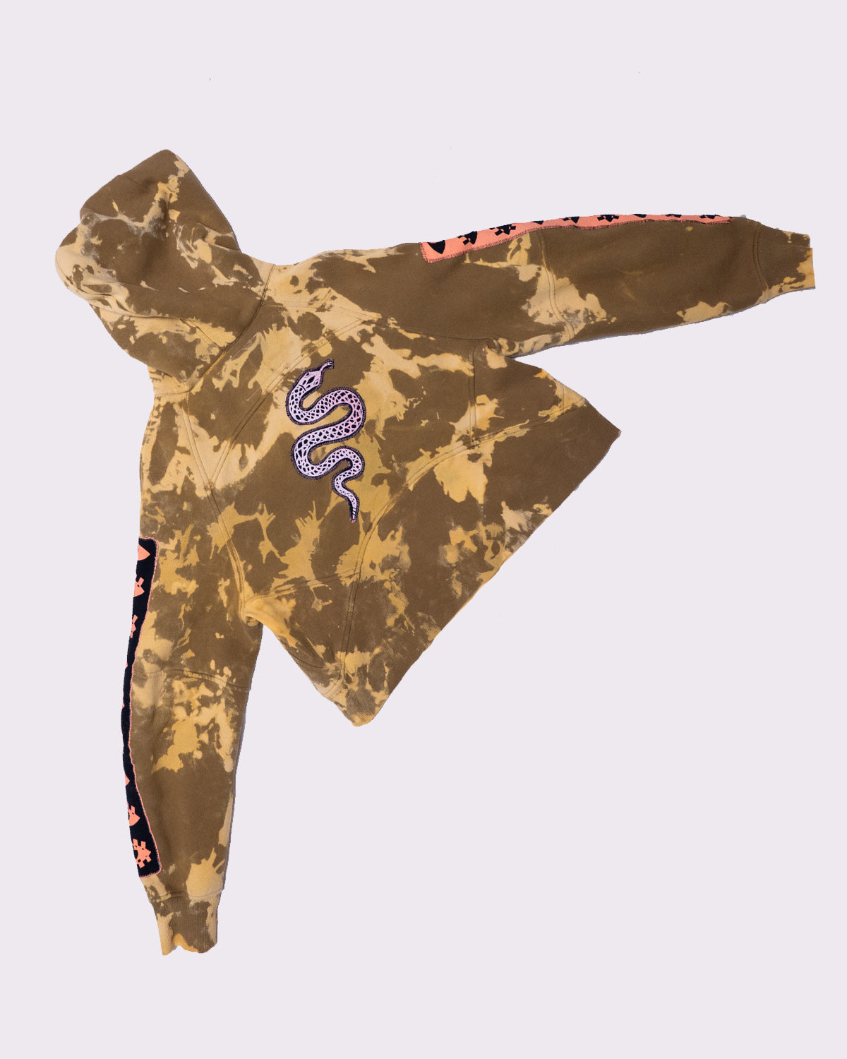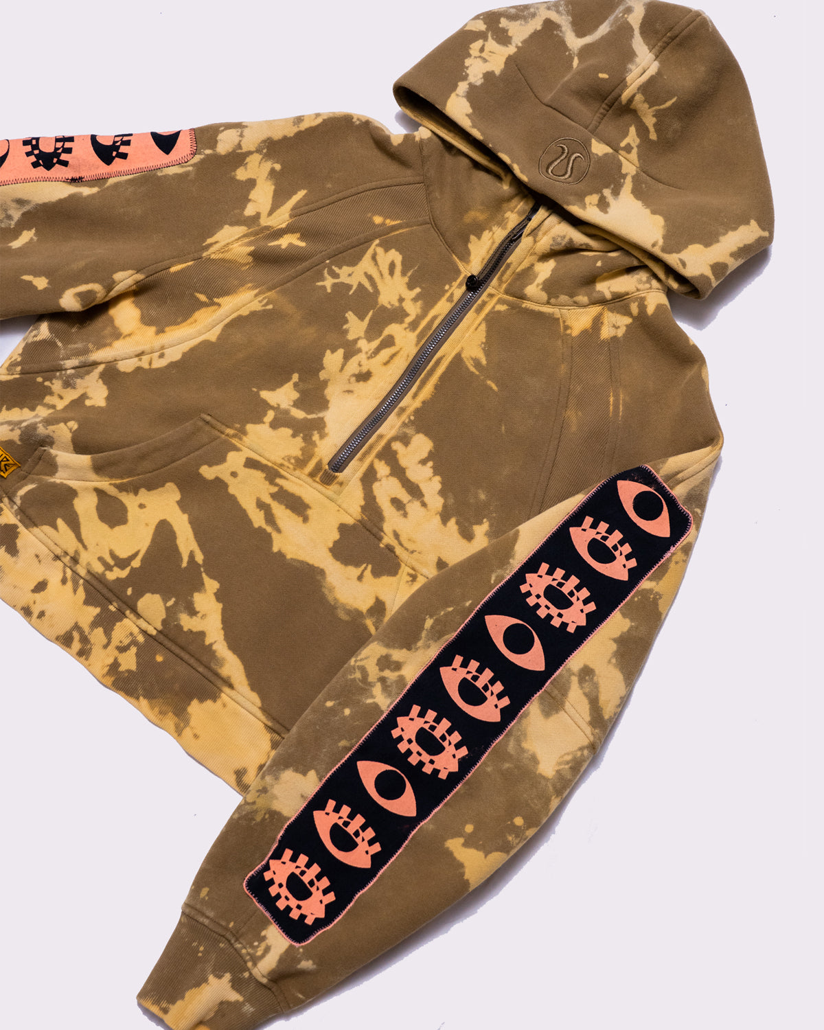 - Design: Black fabric with peach/orange ink, "VISIONARY CHANNELS" Design + "SNAKE" design