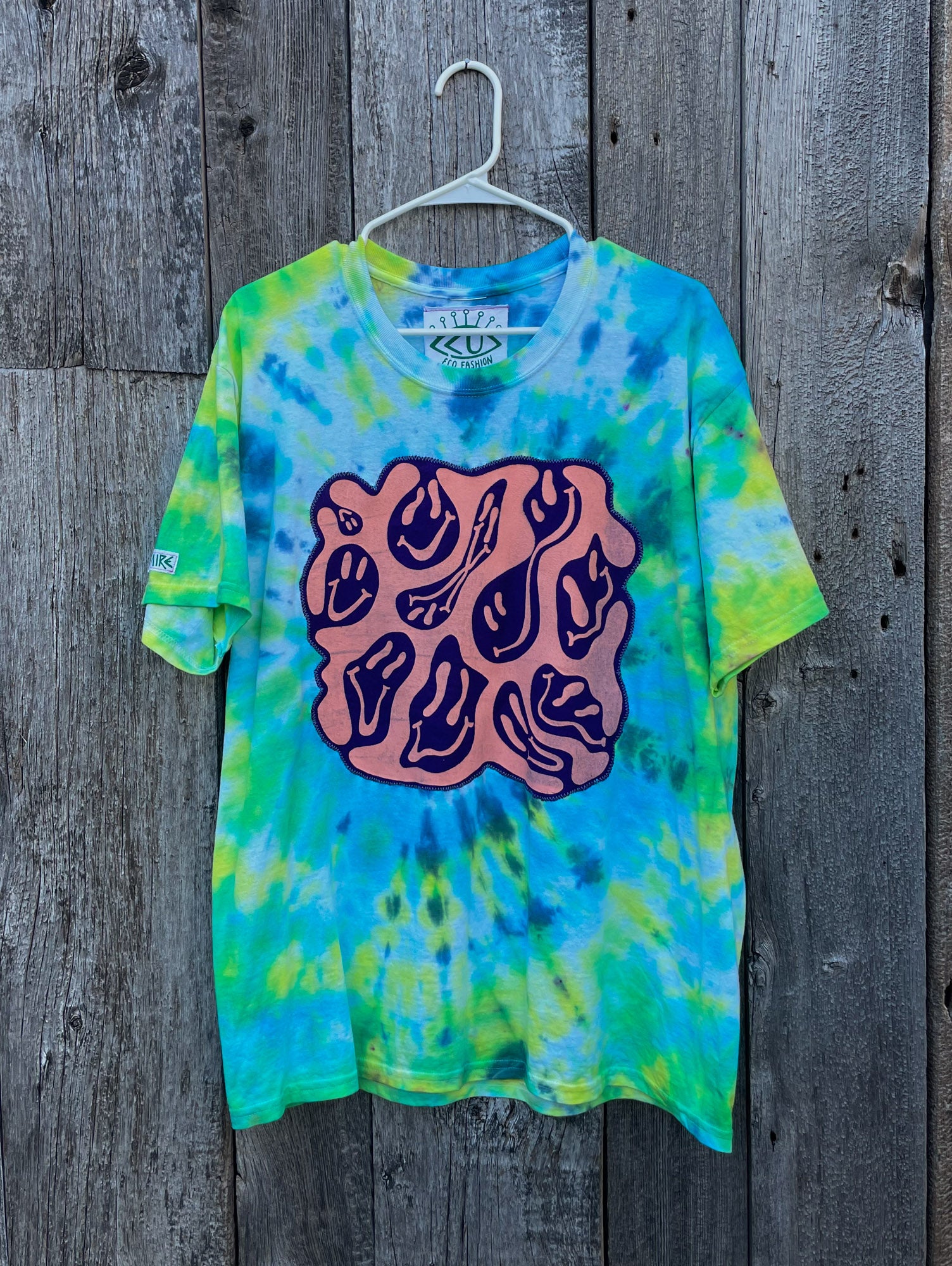 - Hand tie-dyed t-shirt with vivid sky blue, turquoise, navy, neon yellow, bright green & violet colours
