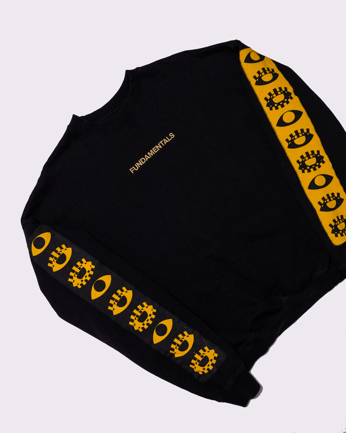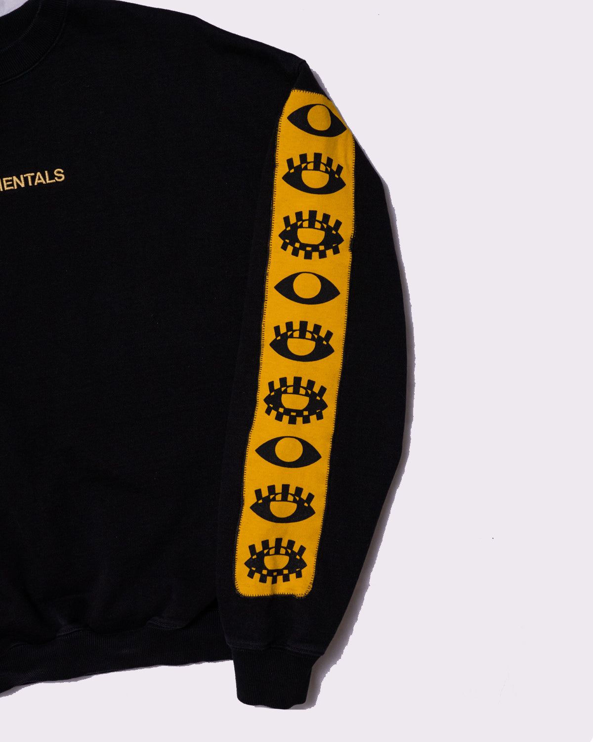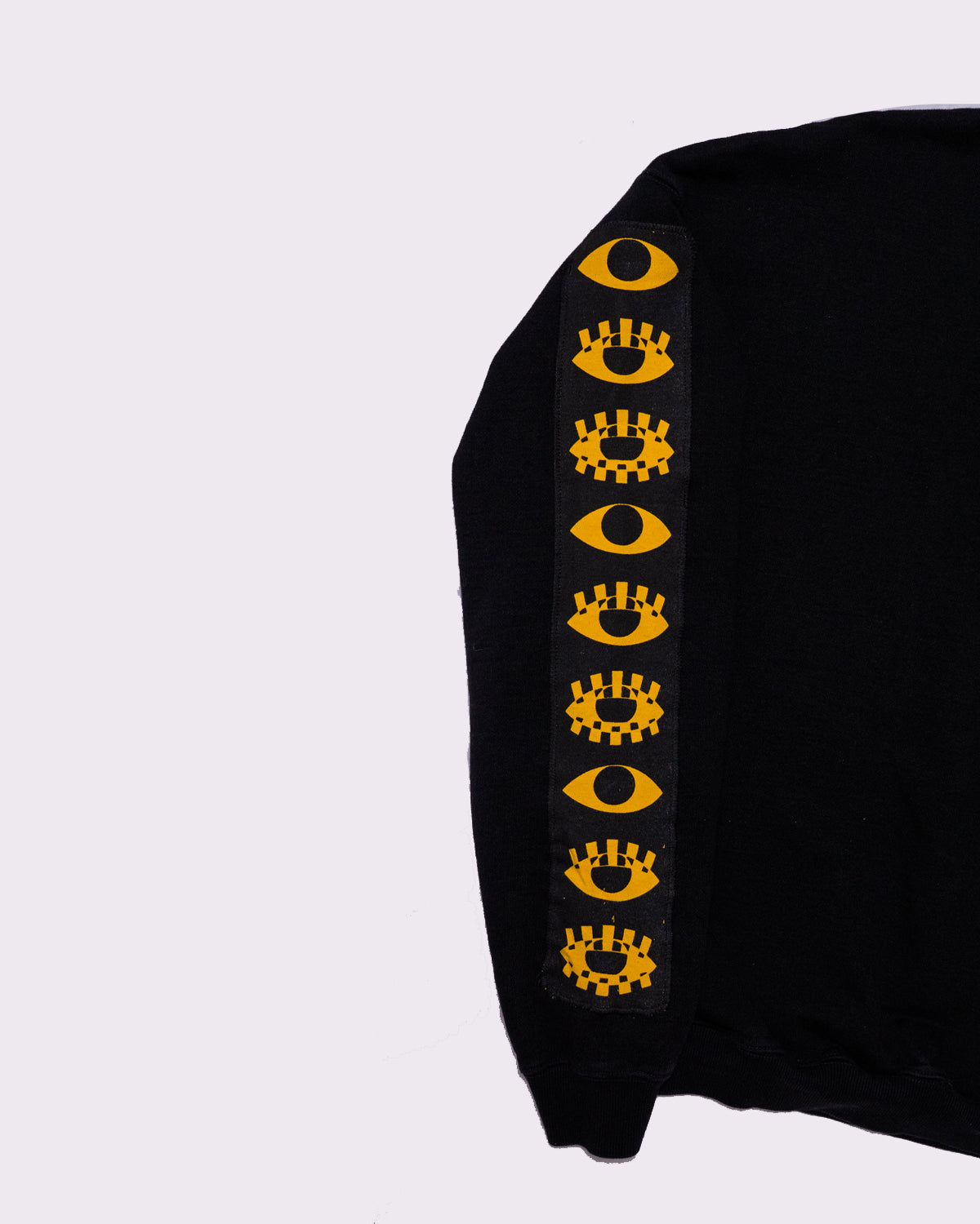 - Design: Mustard yellow fabric with black ink, "VISIONARY CHANNELS" Design