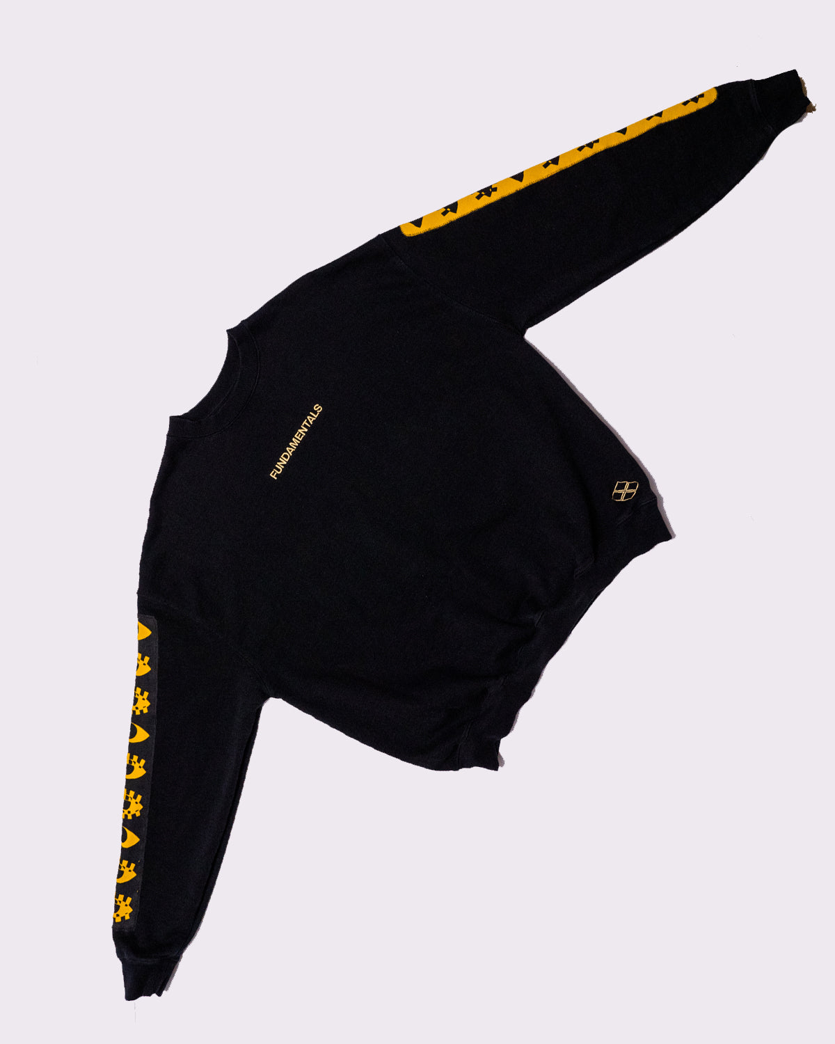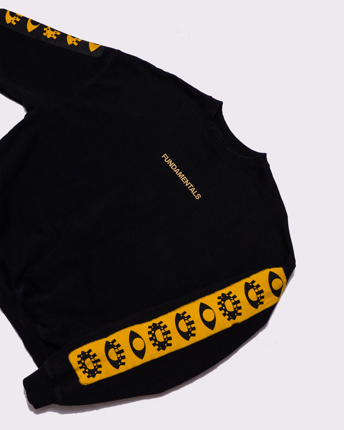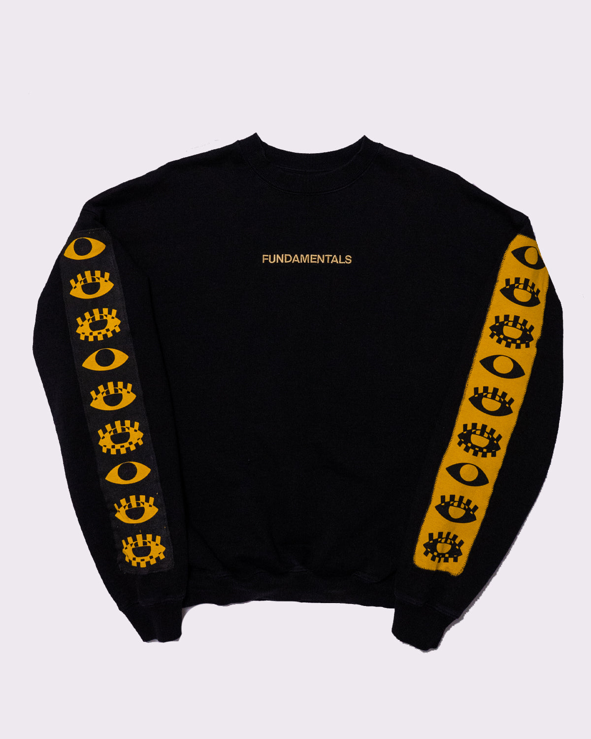 - Design: Mustard yellow fabric with black ink, "VISIONARY CHANNELS" Design