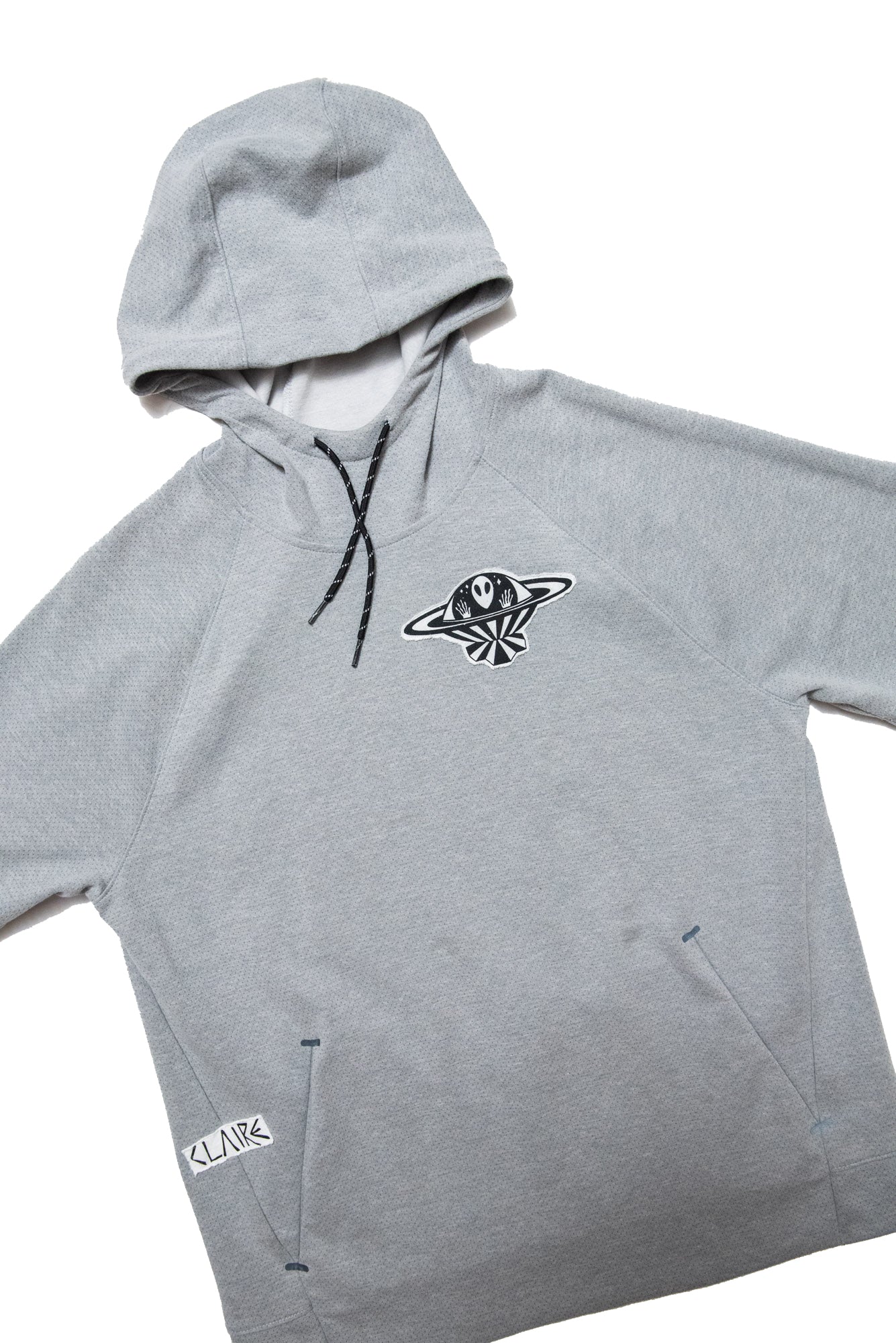 - Grey t-shirt hoodie, slight stretch to it, sweater fabric