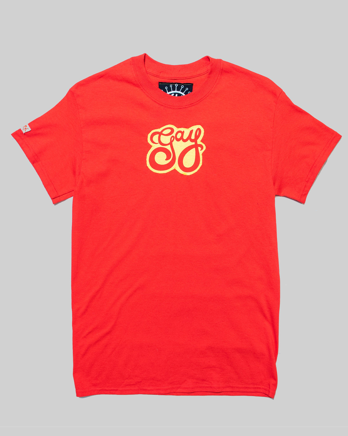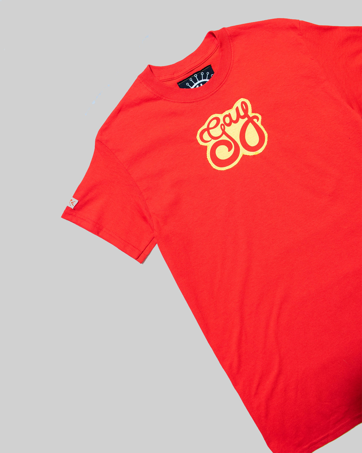 - Design: Yellow green fabric with red ink, "GROOVY GAY" design