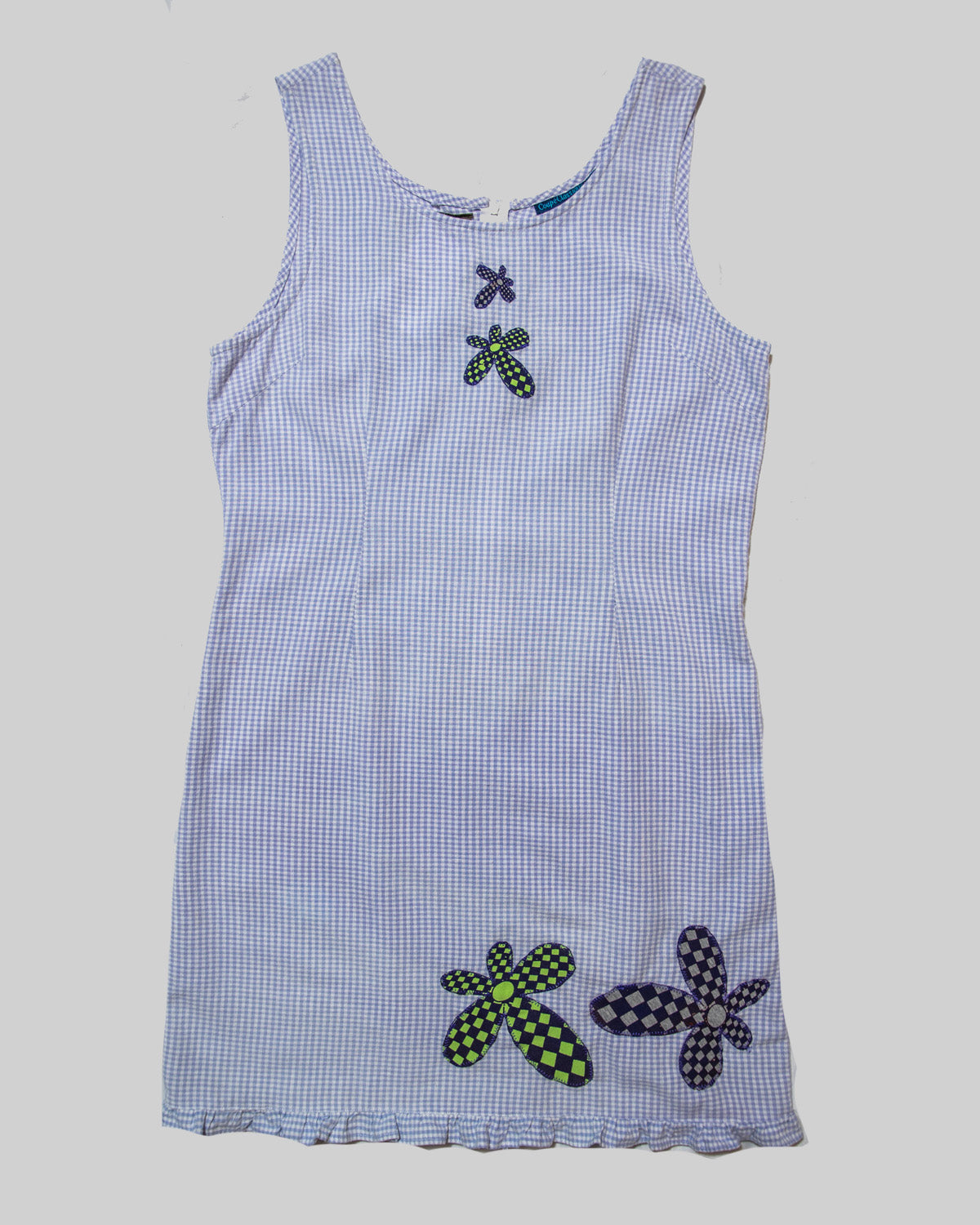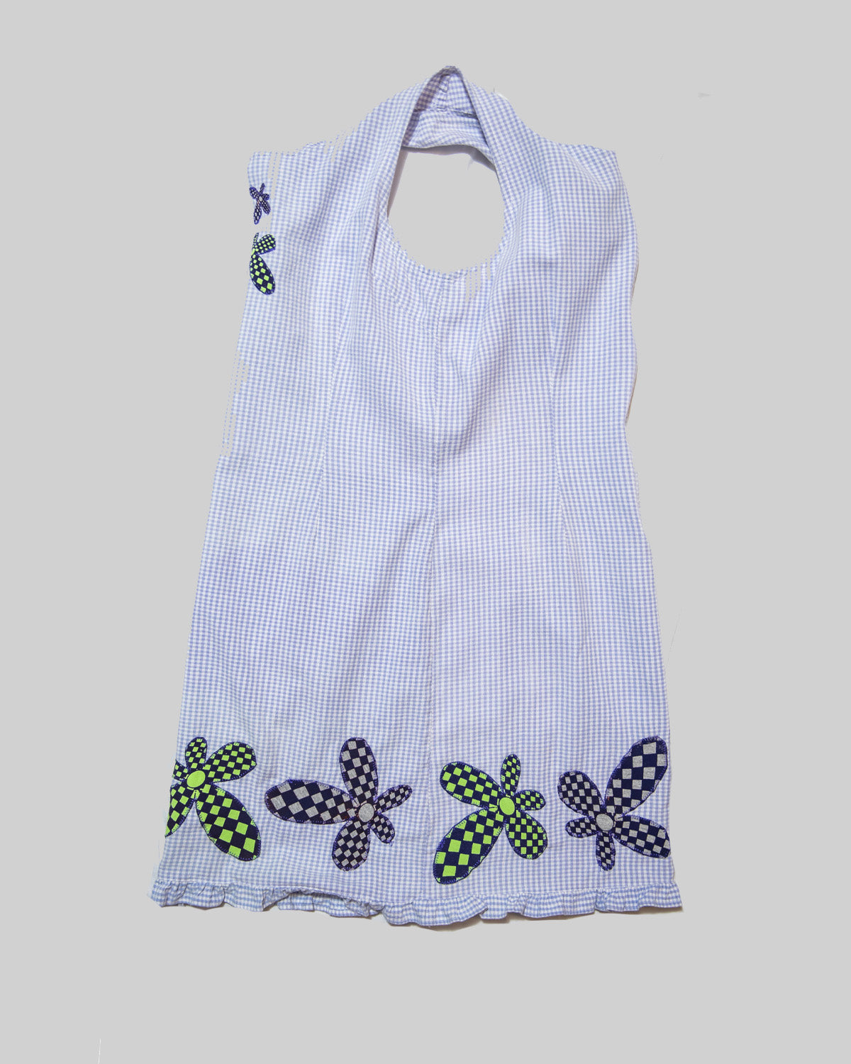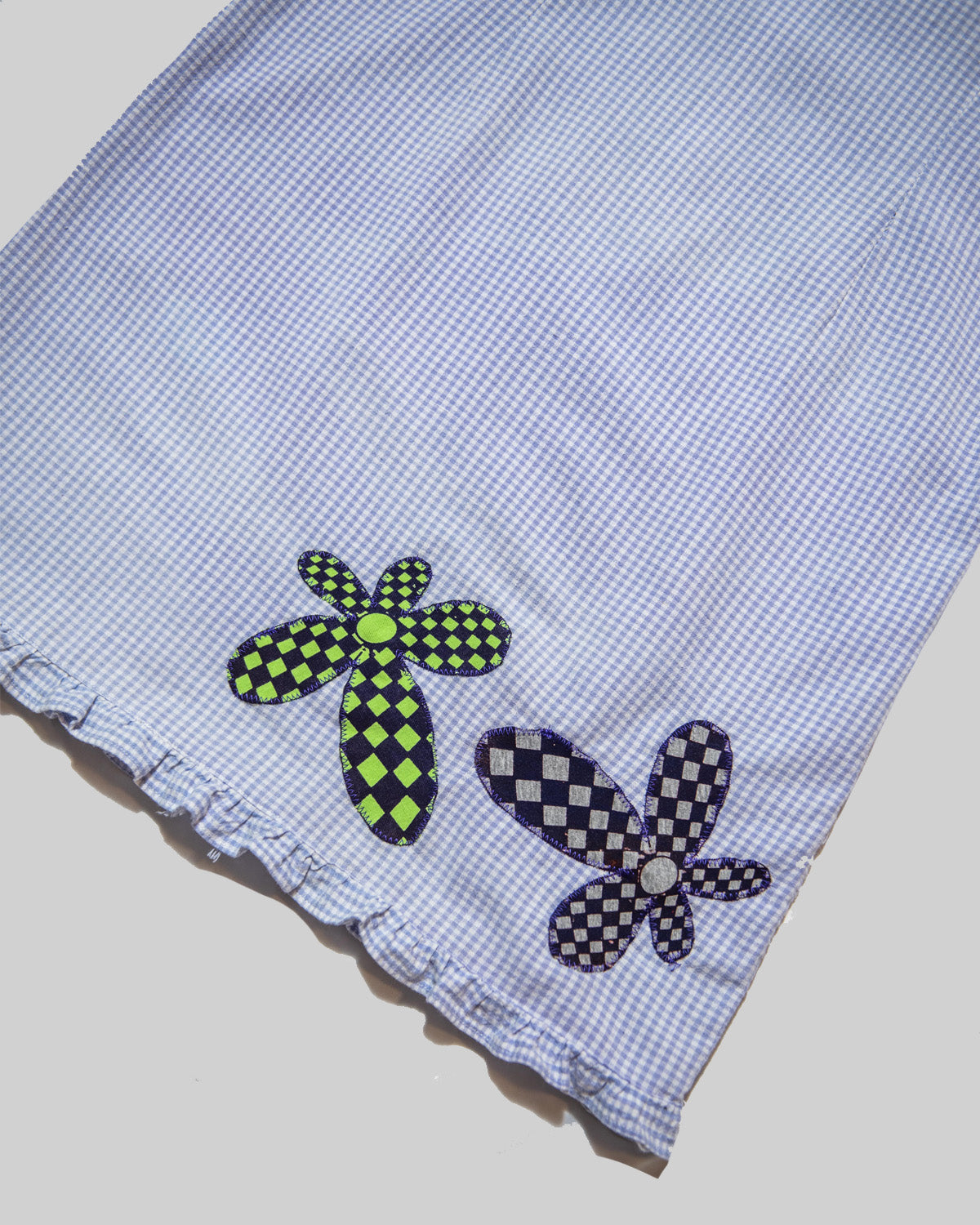 - Design: Lime green & grey fabric with black ink, "CHECKER FLOWER" design