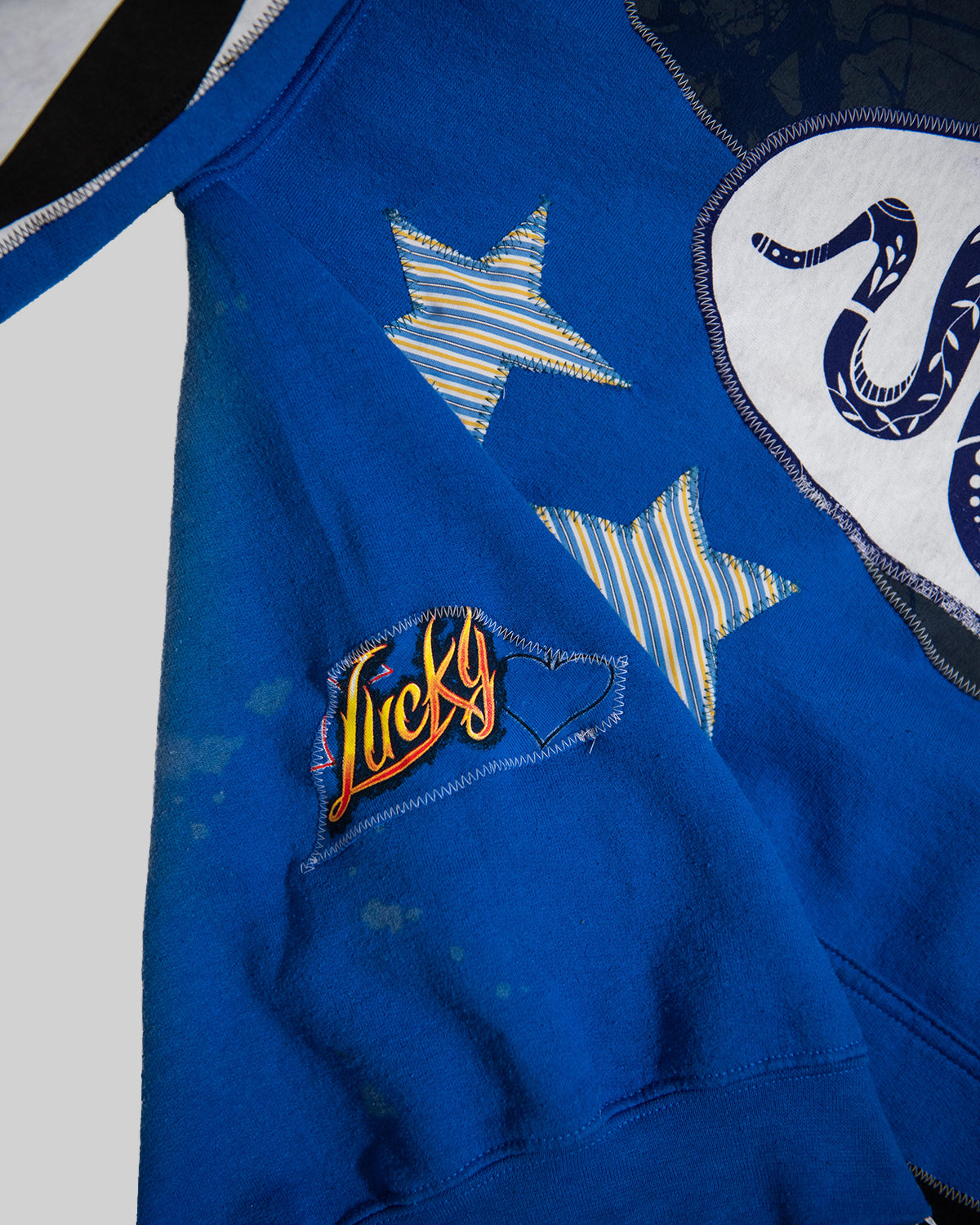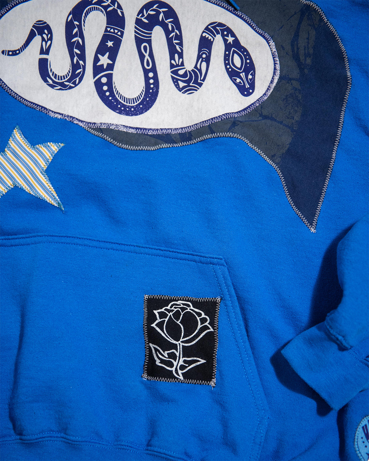 - Design: bleach dye transfer with leaves, white fabric with indigo ink, "OVAL SNAKE" Design, + Scraps + "ROSE", + "EYE" design
