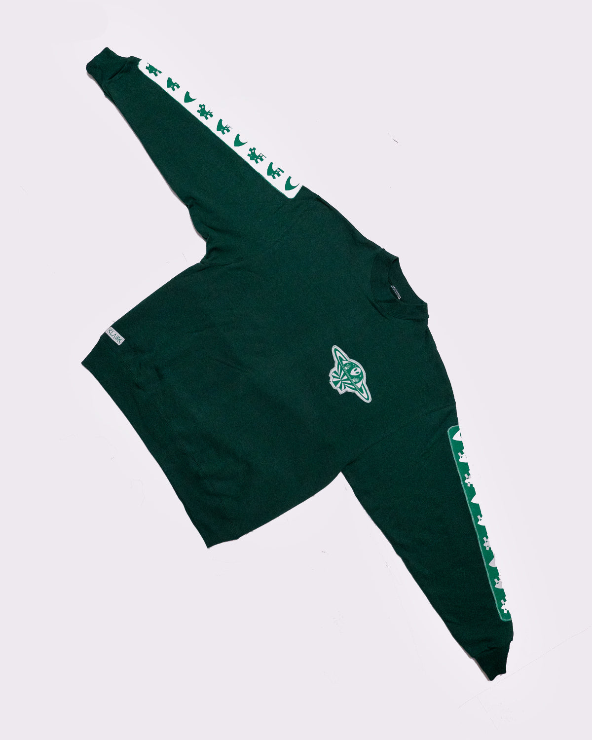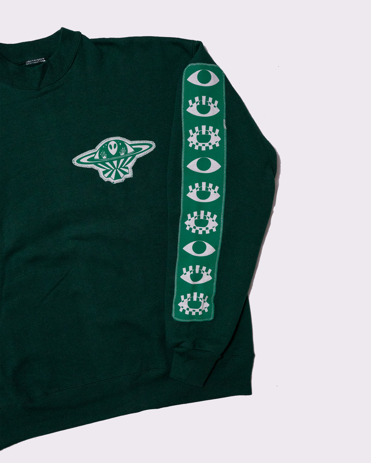 - Design: White fabric with bright green ink, "VISIONARY CHANNELS" Design