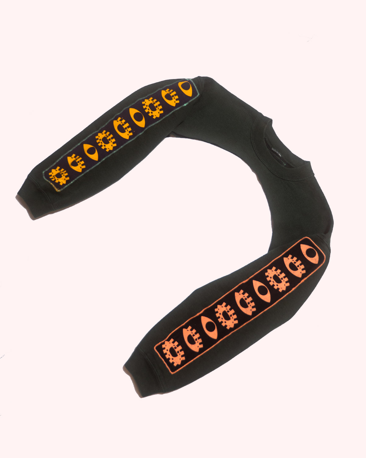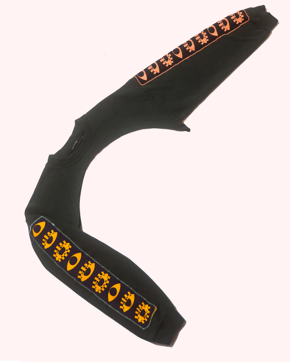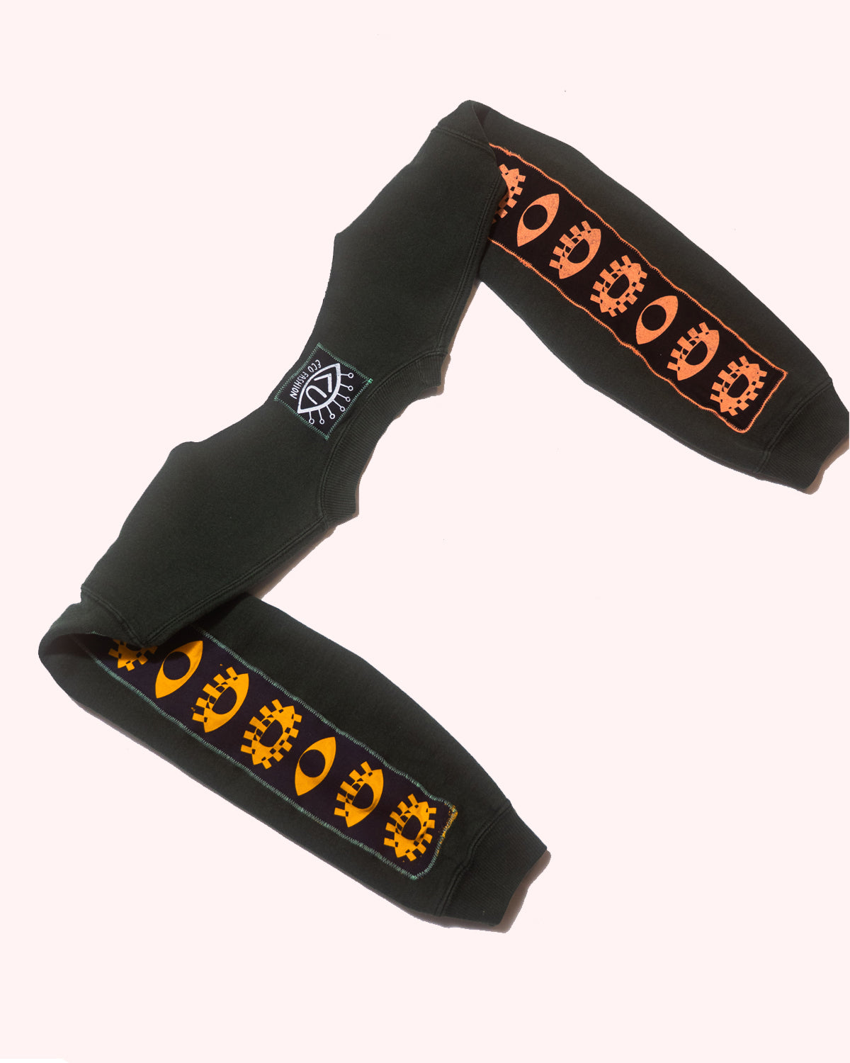 - Design: Mustard fabric with navy ink/ black fabric with peach ink, "VISIONARY CHANNELS" Design