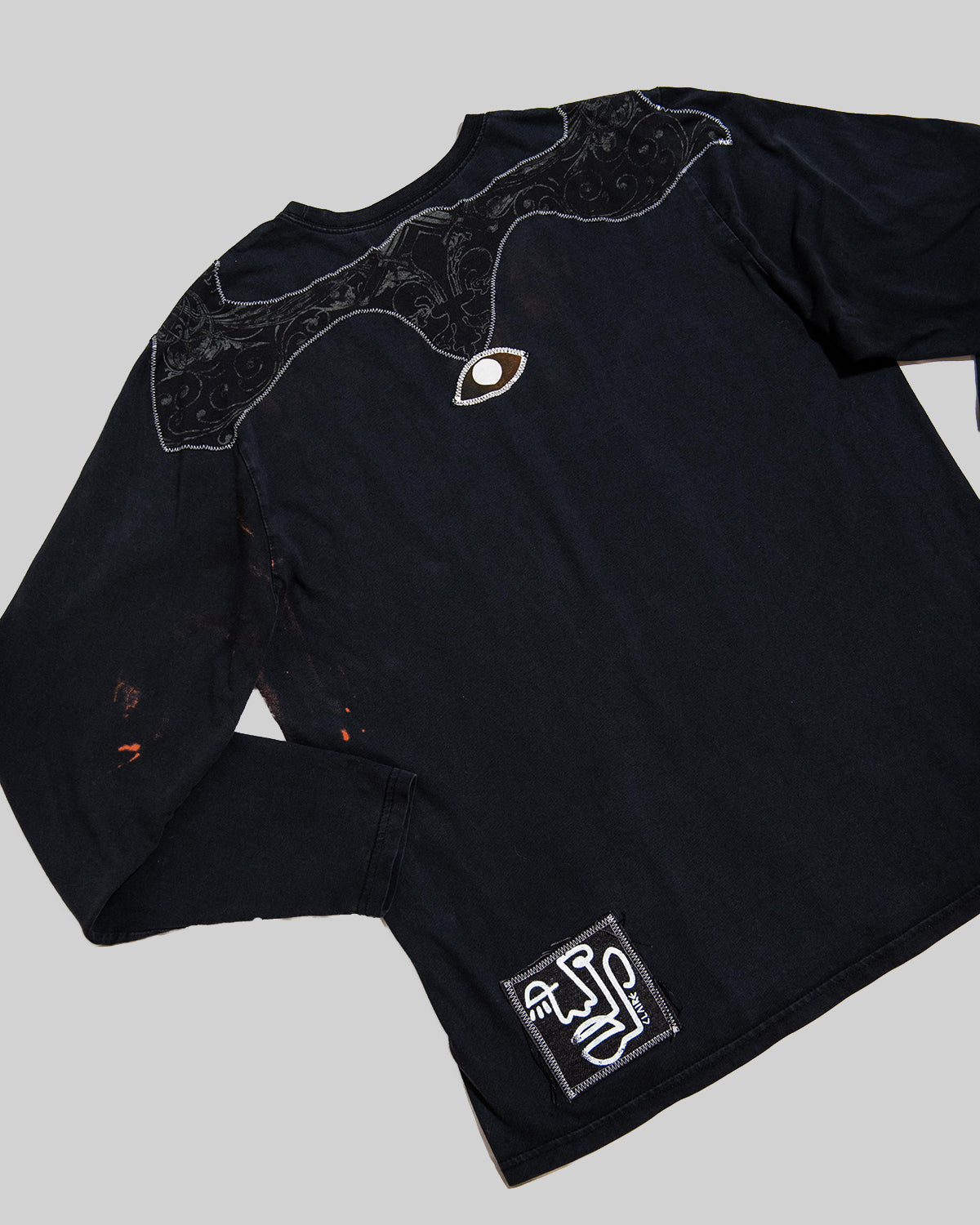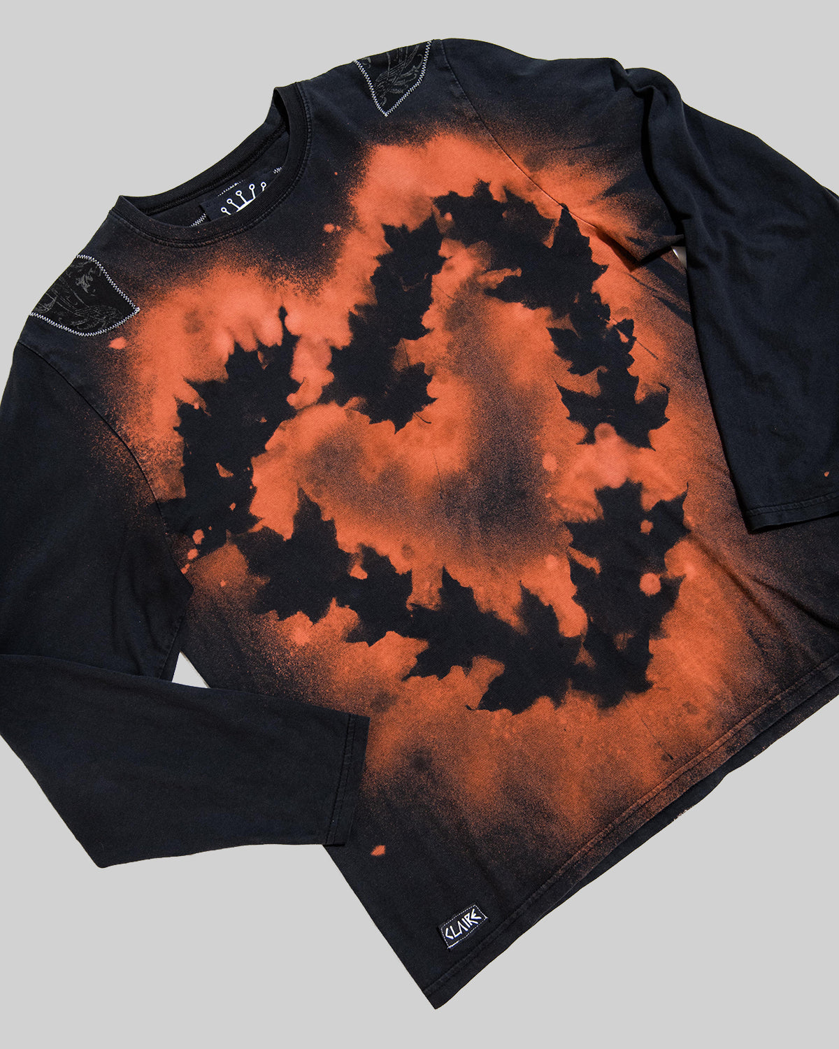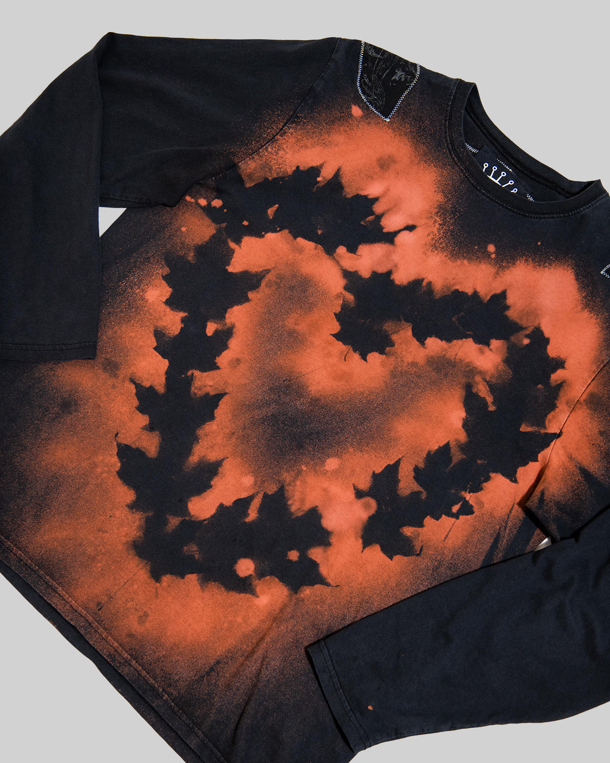 - Design: bleach dye transfer print with leaves + "EYE" + "small 1 LINE FACE" design + scraps