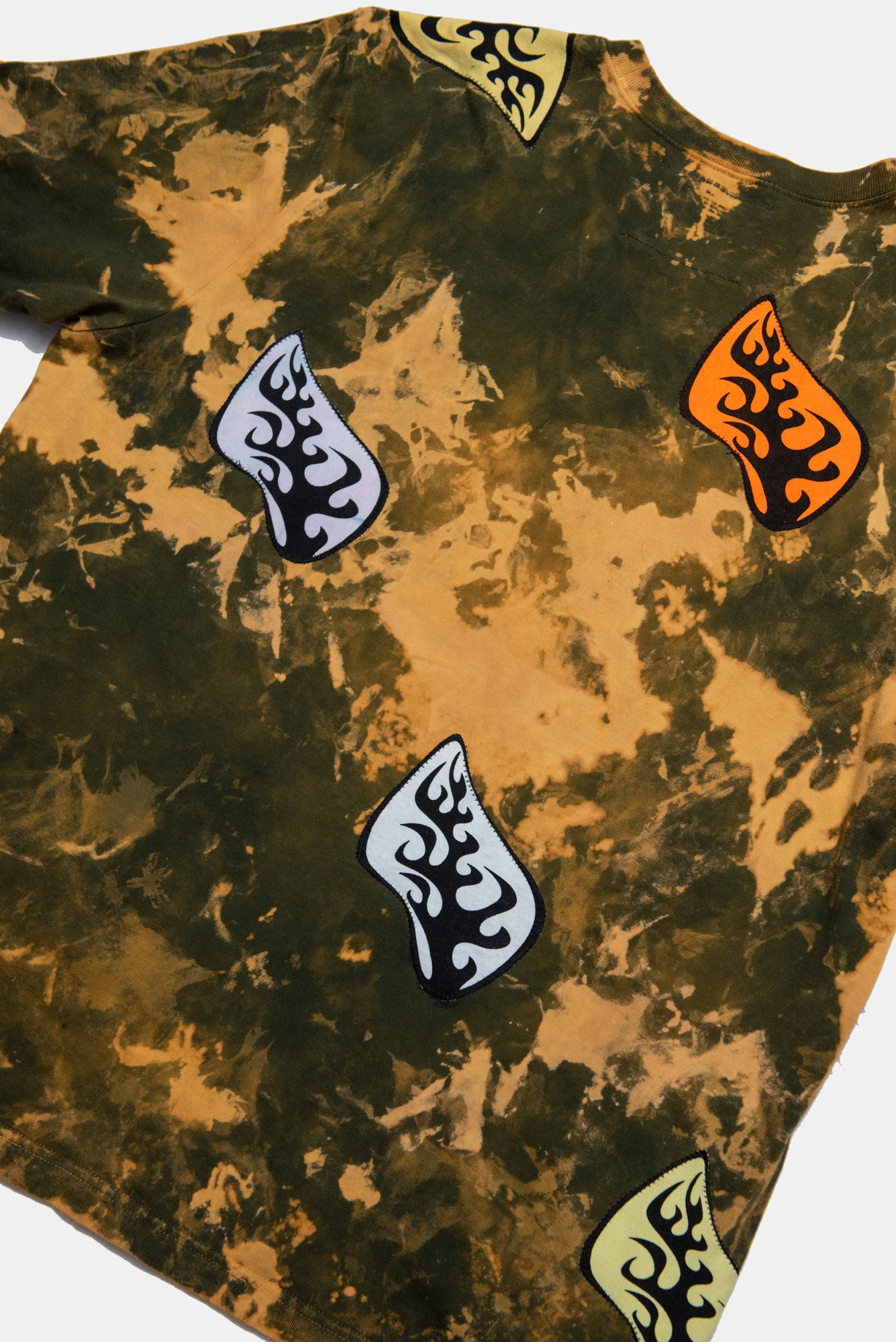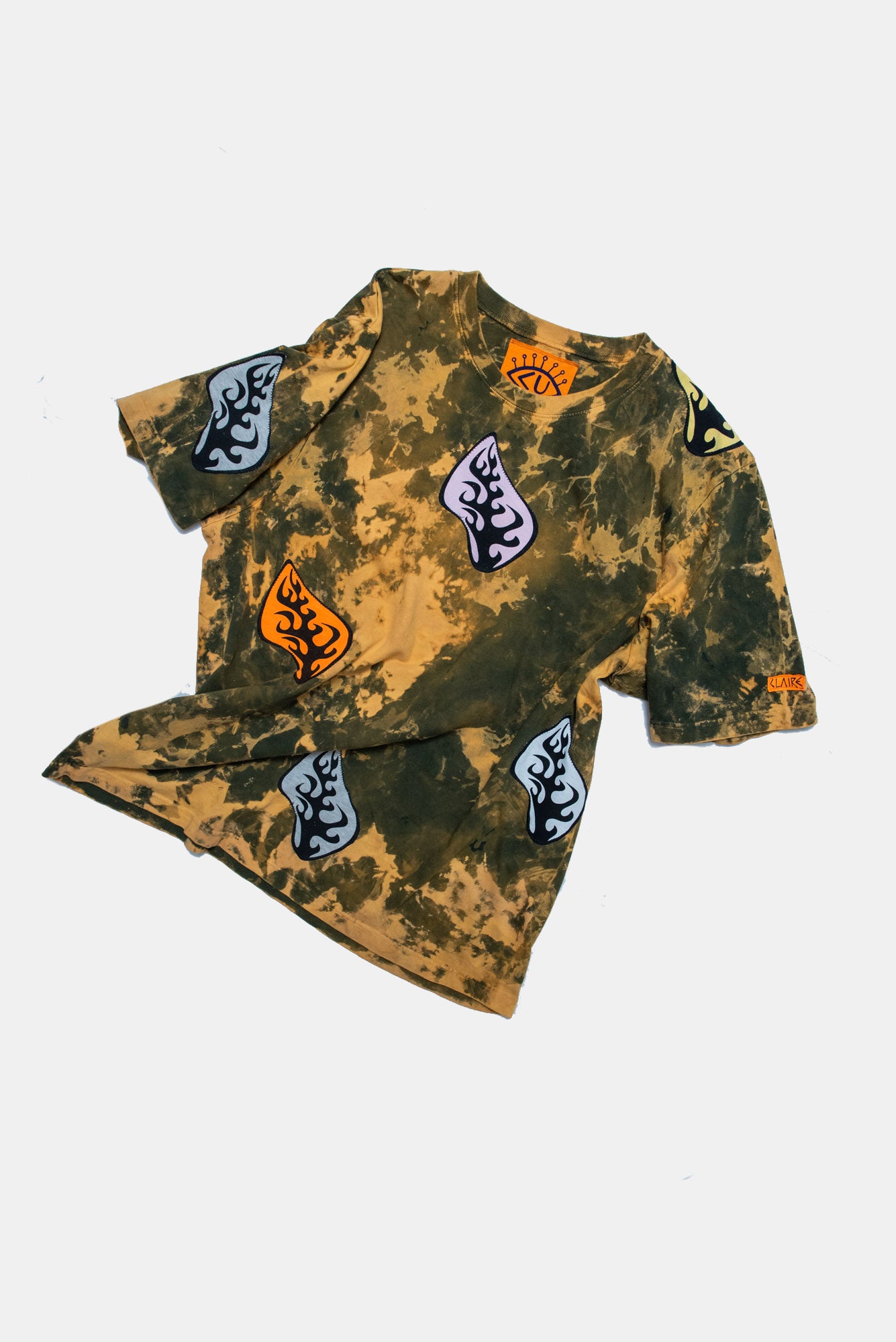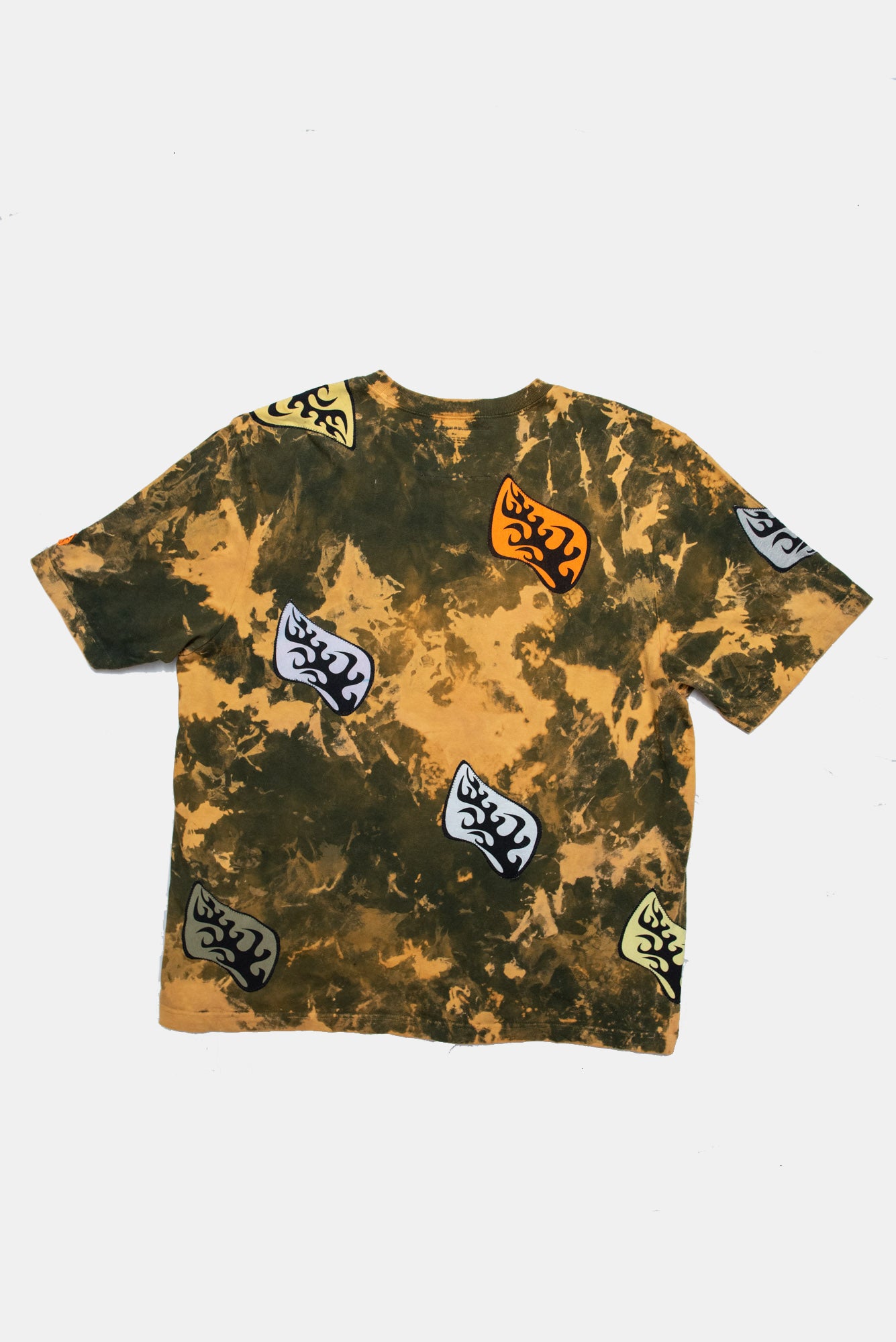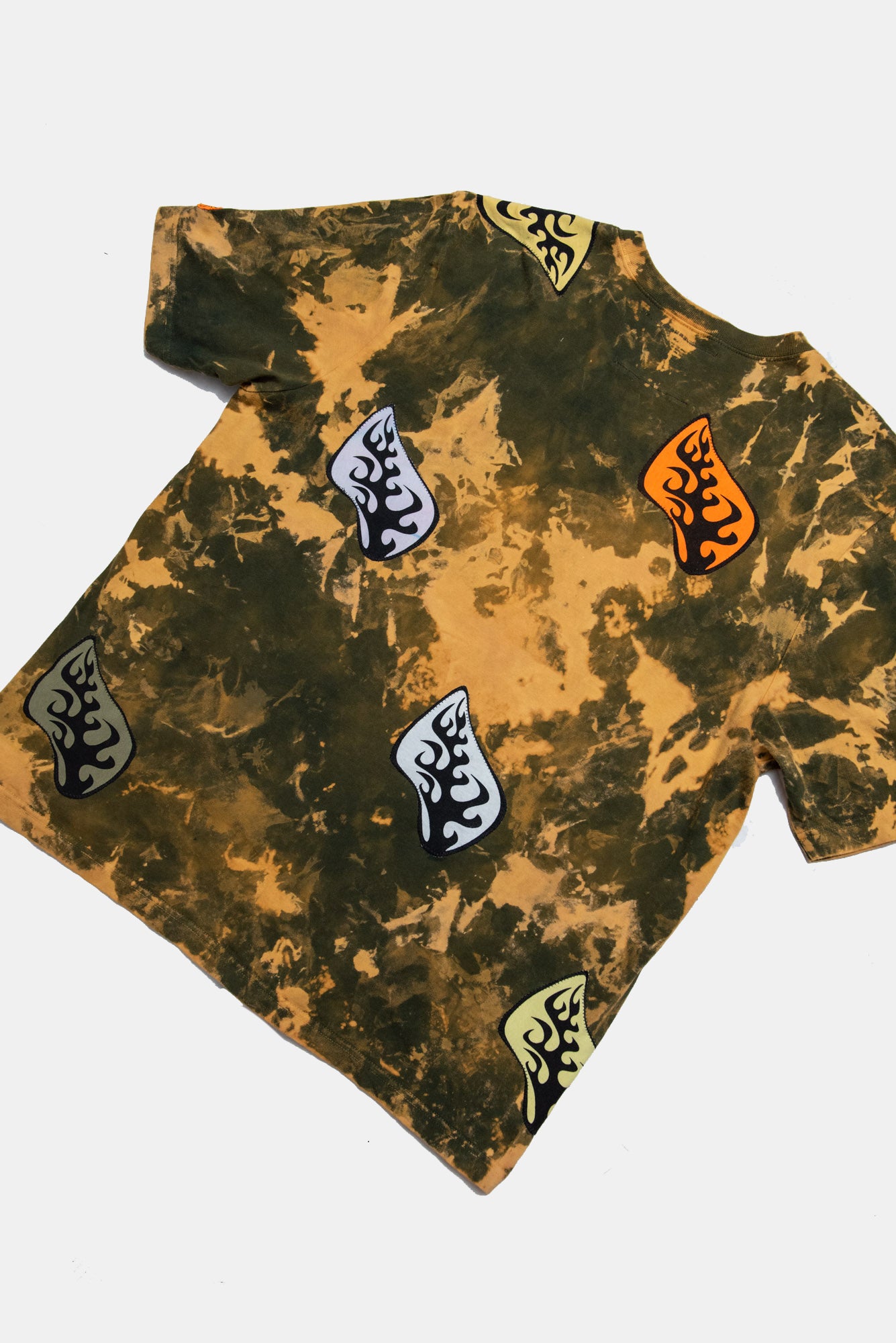 - Hand tie-dyed t-shirt with olive and forest green, golden orange colours