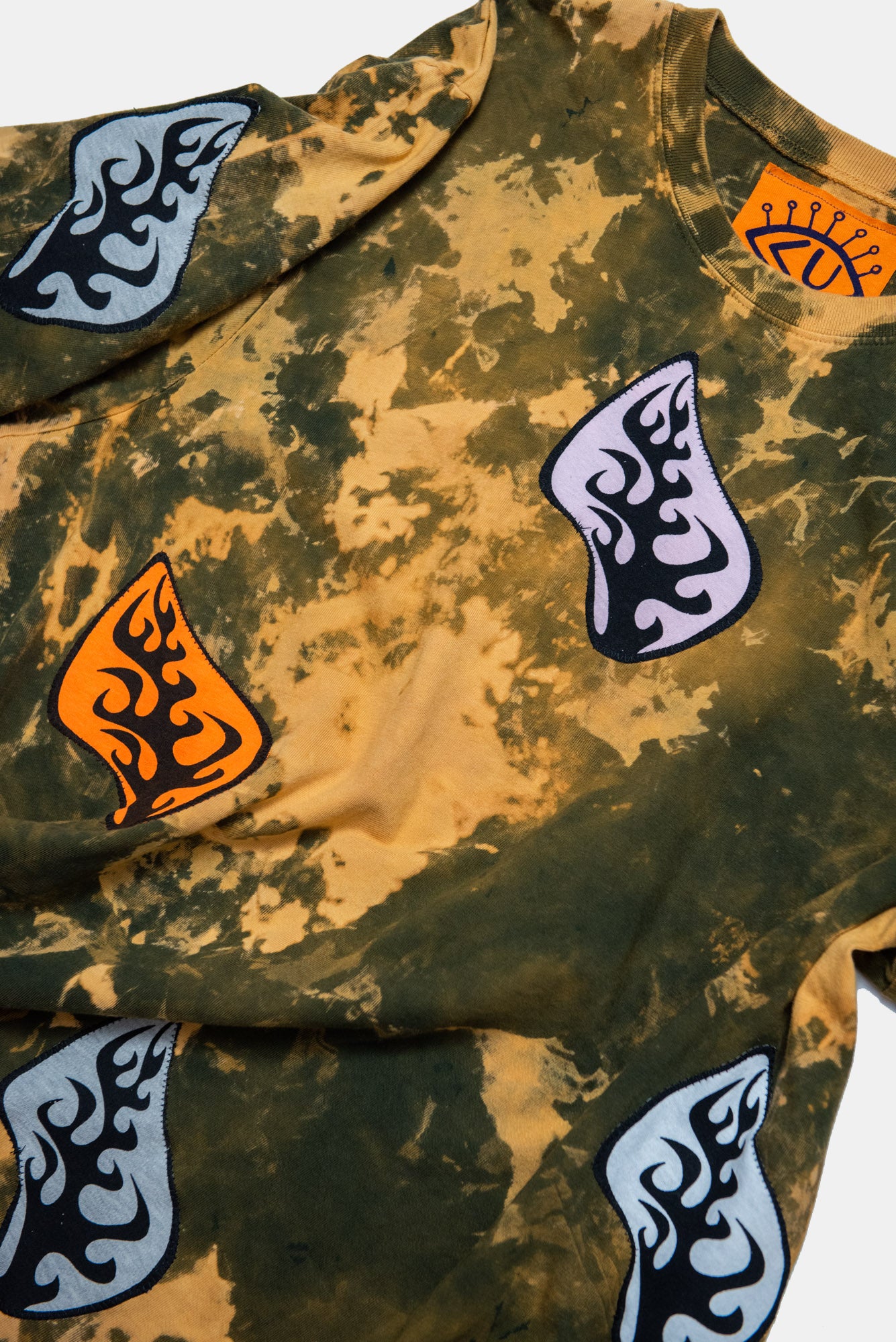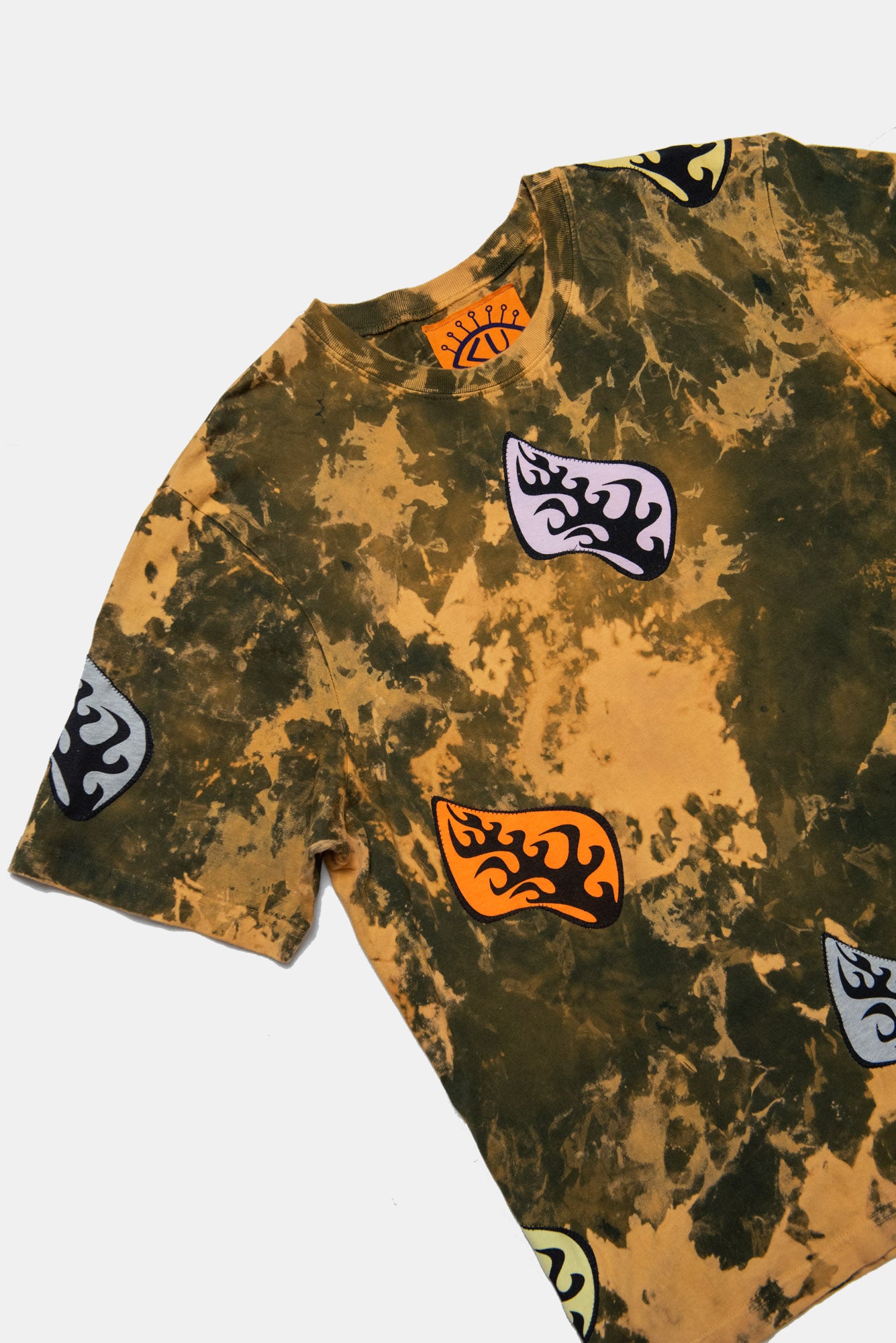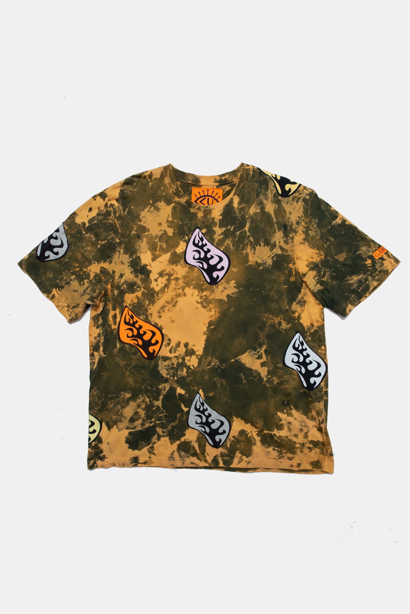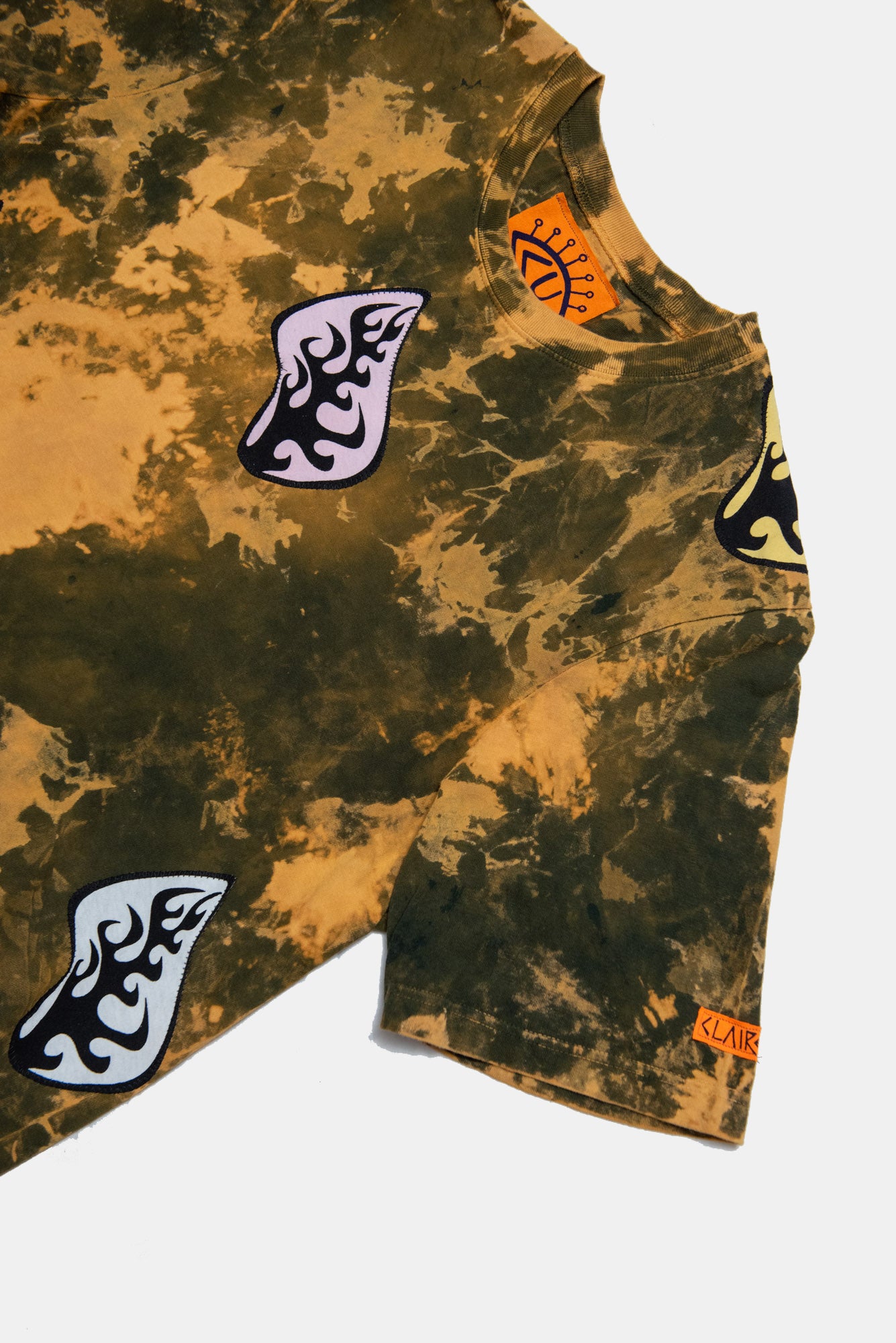 - Hand tie-dyed t-shirt with olive and forest green, golden orange colours