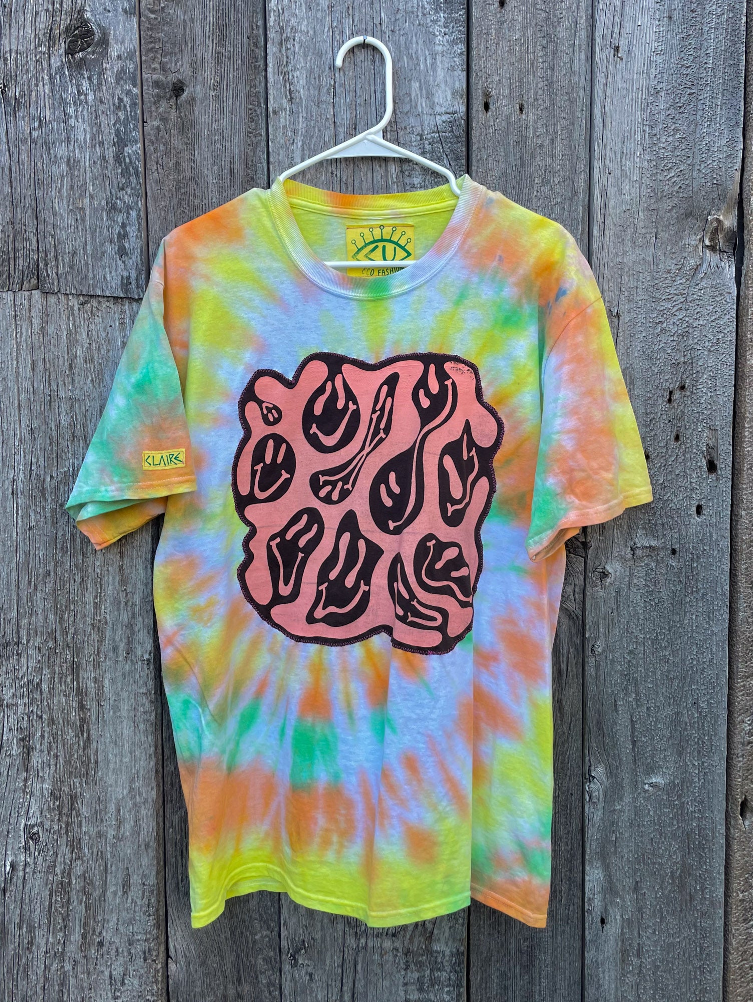 - Hand tie-dyed t-shirt with yellow, green, orange