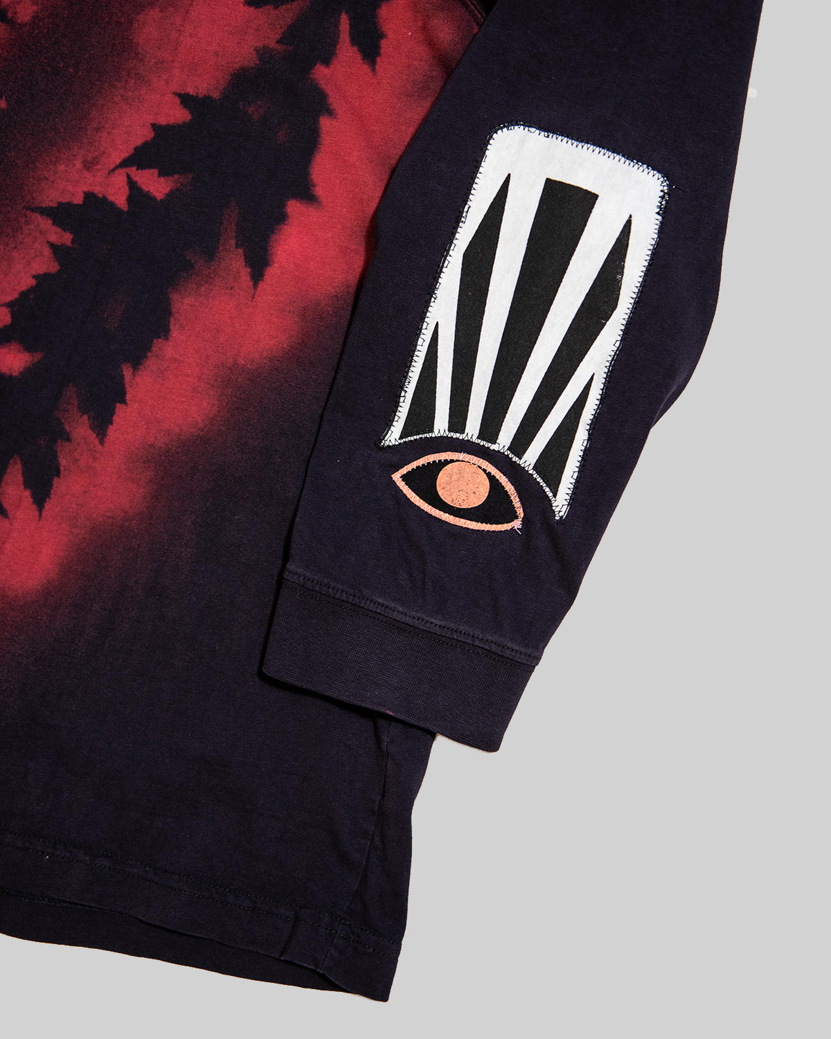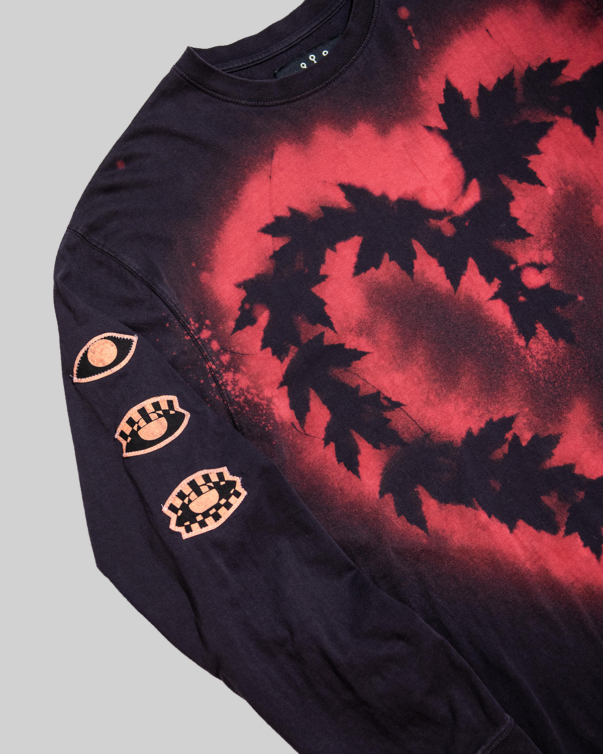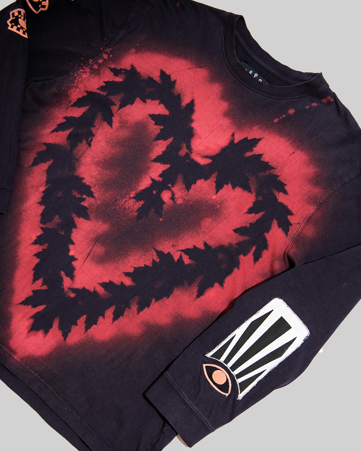 - Design: bleach dye transfer print with leaves + "EYE" designs