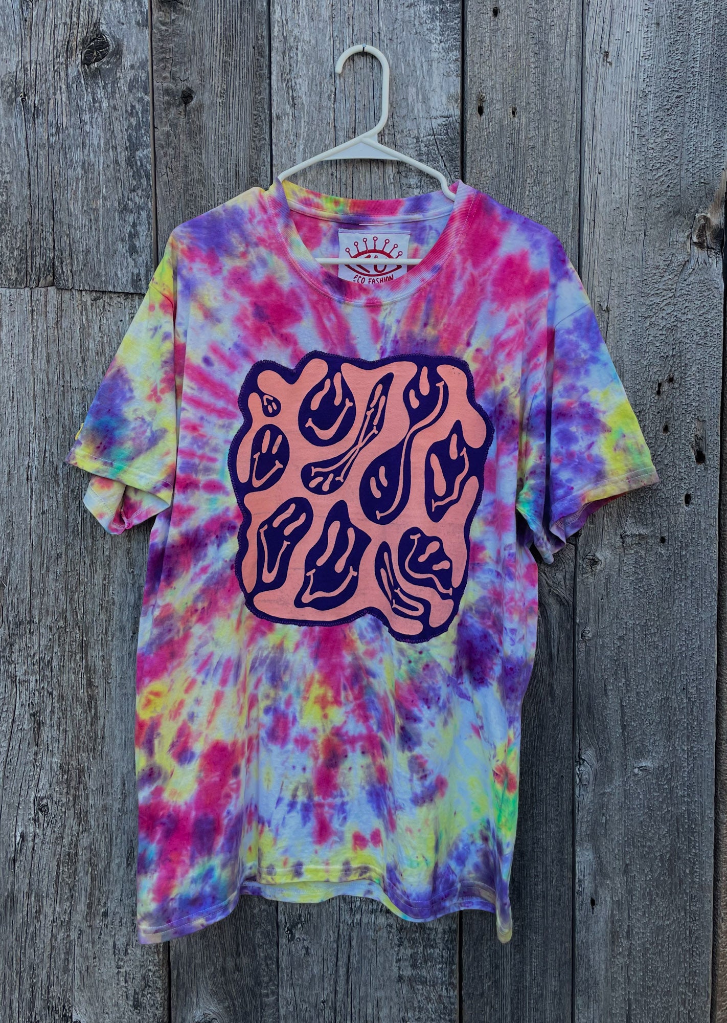 - Hand tie-dyed t-shirt with rainbow style, purples, yellows, reds
