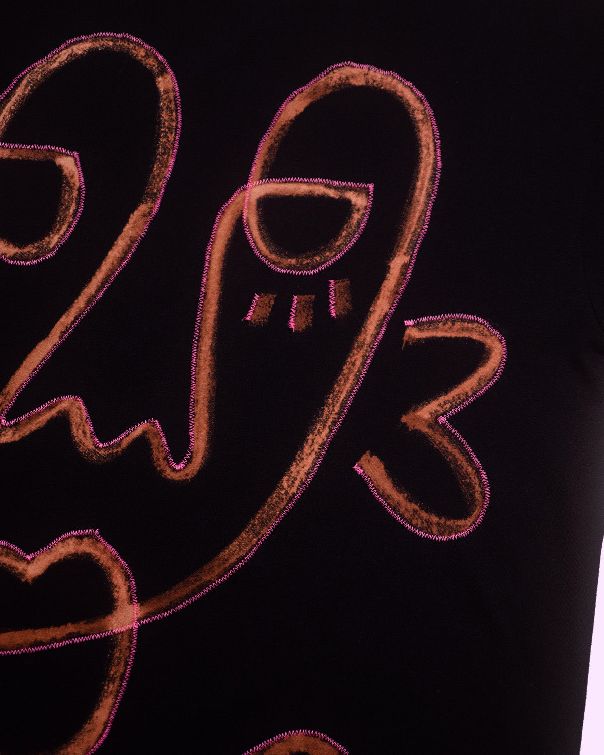 - Design: Hand-painted 1-Line Face with bleach dye transfer & sewn stitched light pink thread