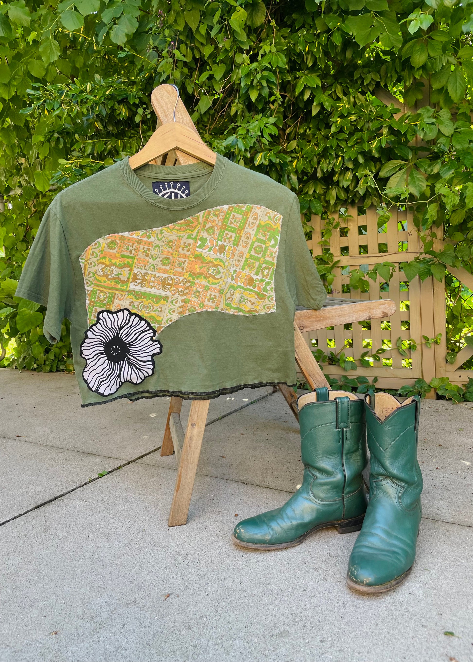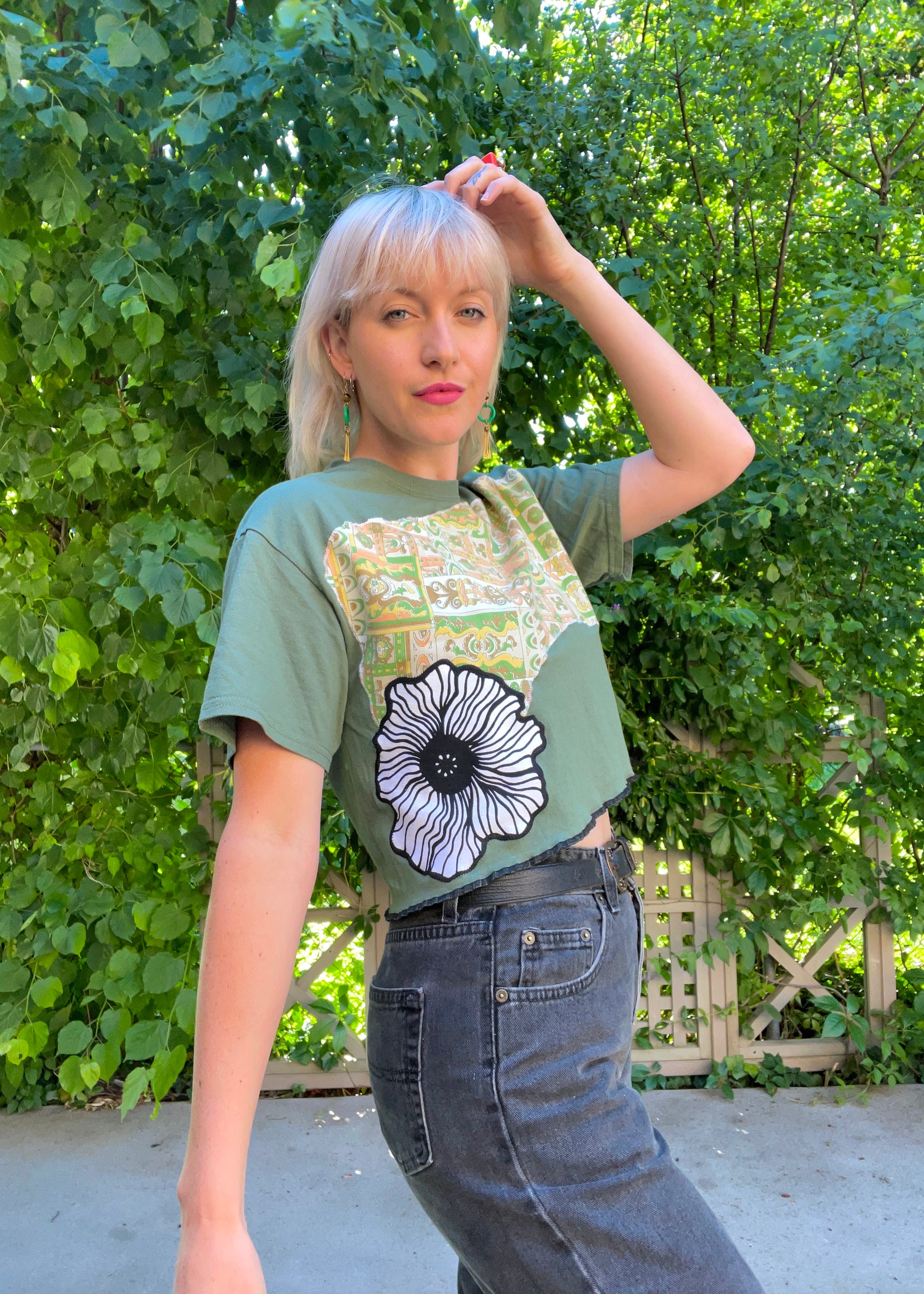 - Crop top olive green t-shirt with "POPPY" design & vintage fabric