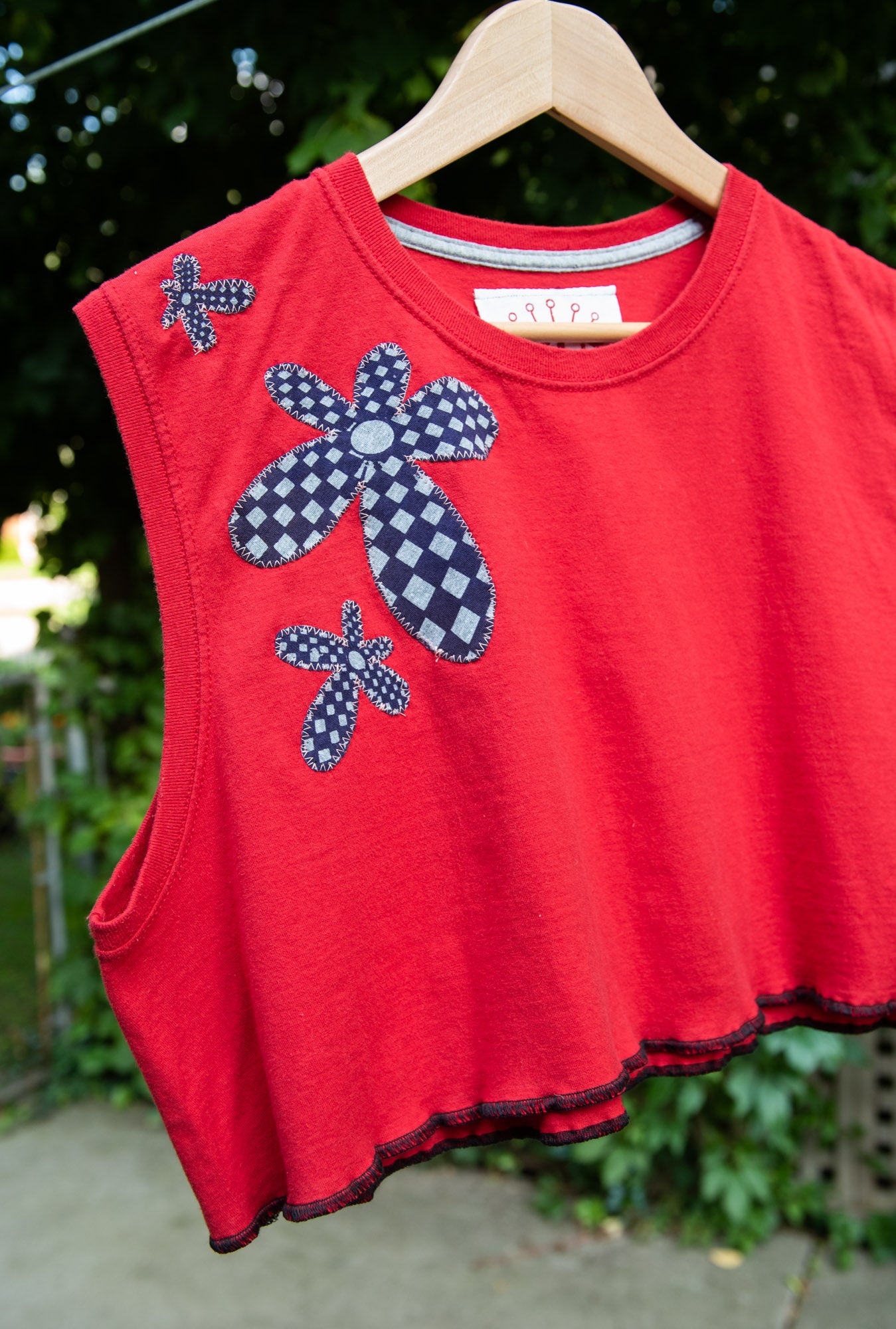 - Red crop top muscle tank with "CHECKER FLOWER" design