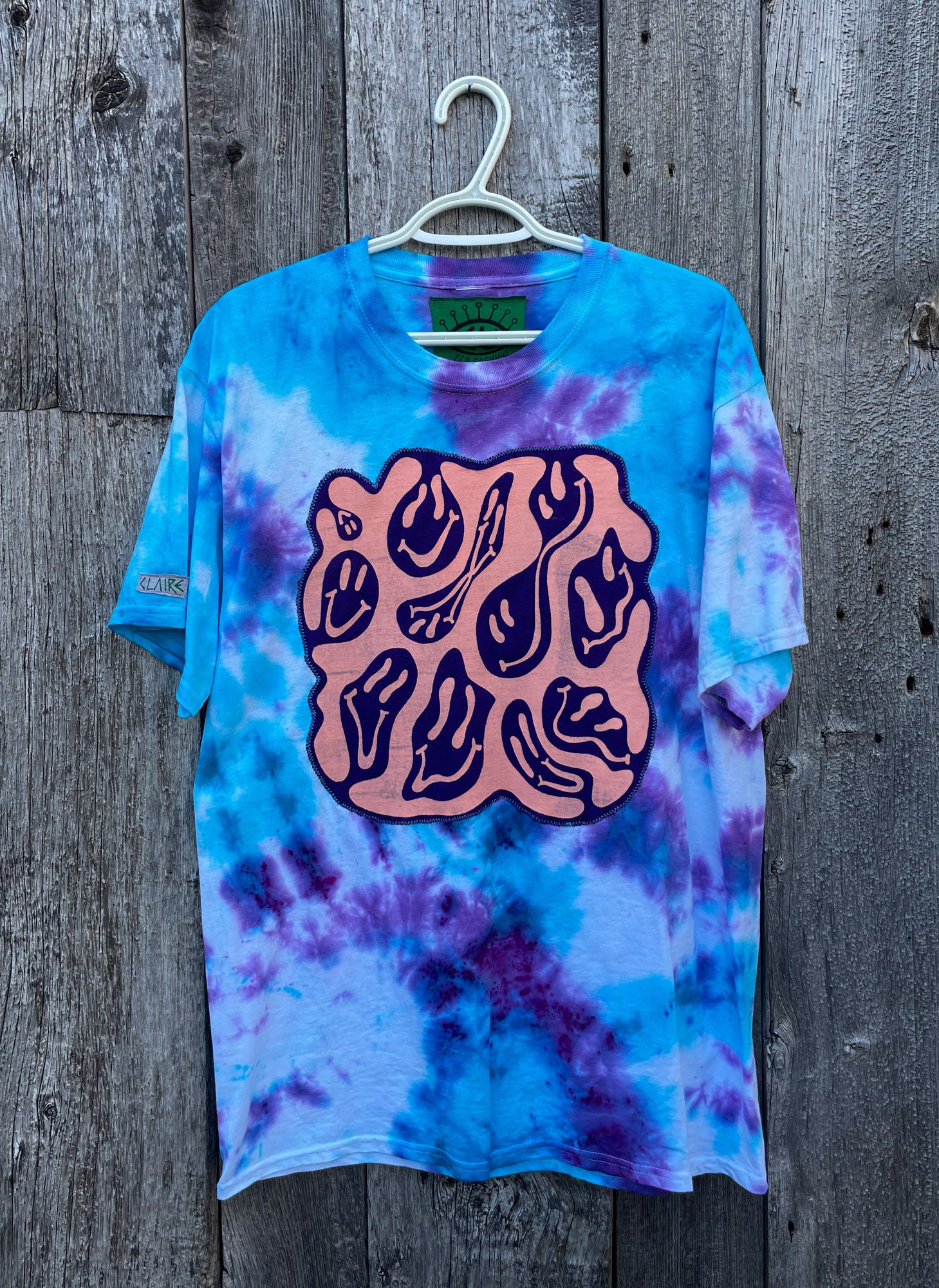 - Hand tie-dyed t-shirt with vivid sky blue and purple