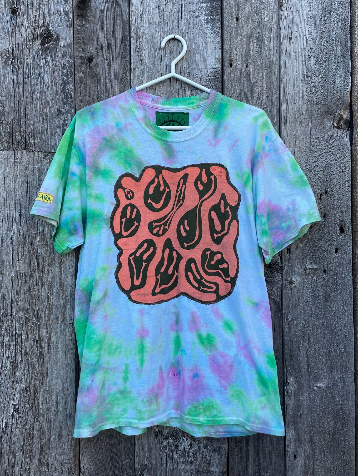 - Hand tie-dyed t-shirt with light blue background, green and pink colours