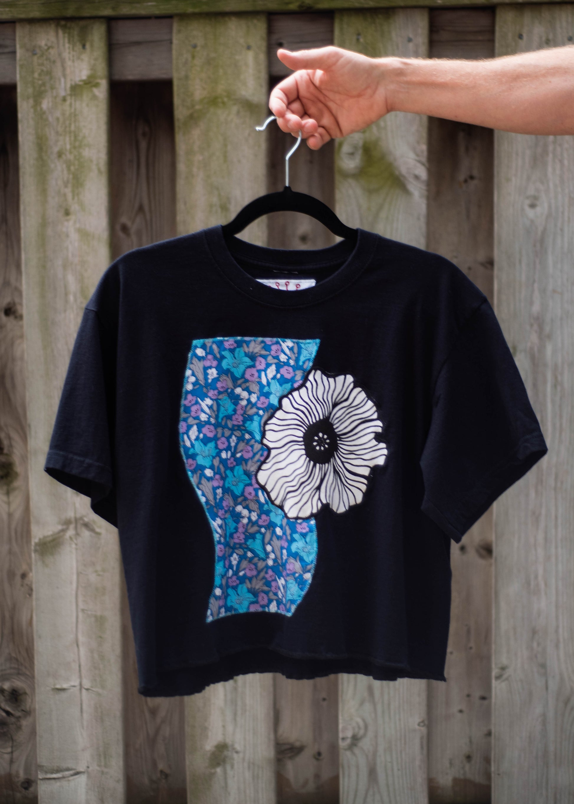 - Black T-Shirt with "POPPY" design & vintage fabric