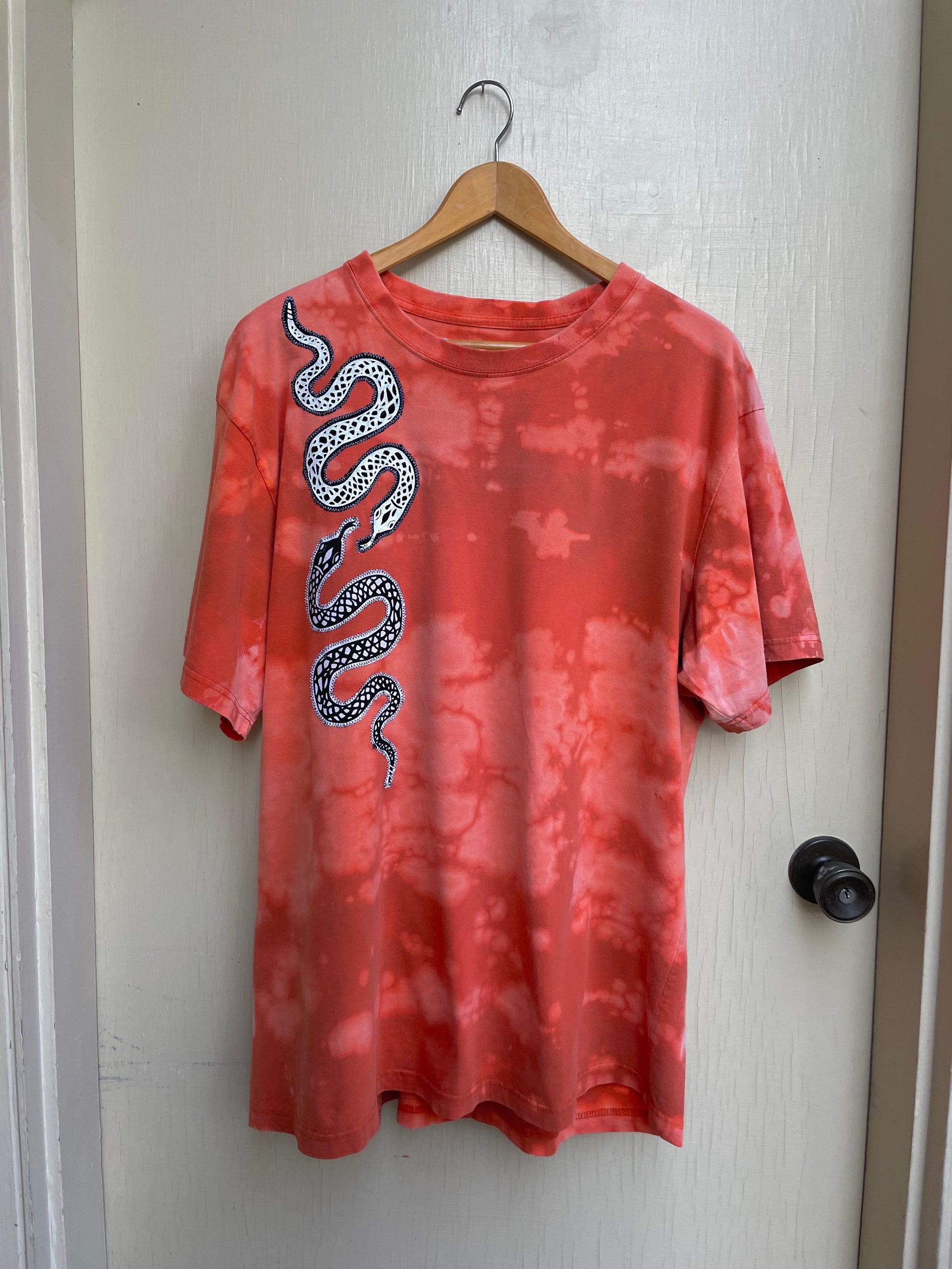 - Orange & cream coloured hand bleach-dyed T-Shirt with "SNAKES" design