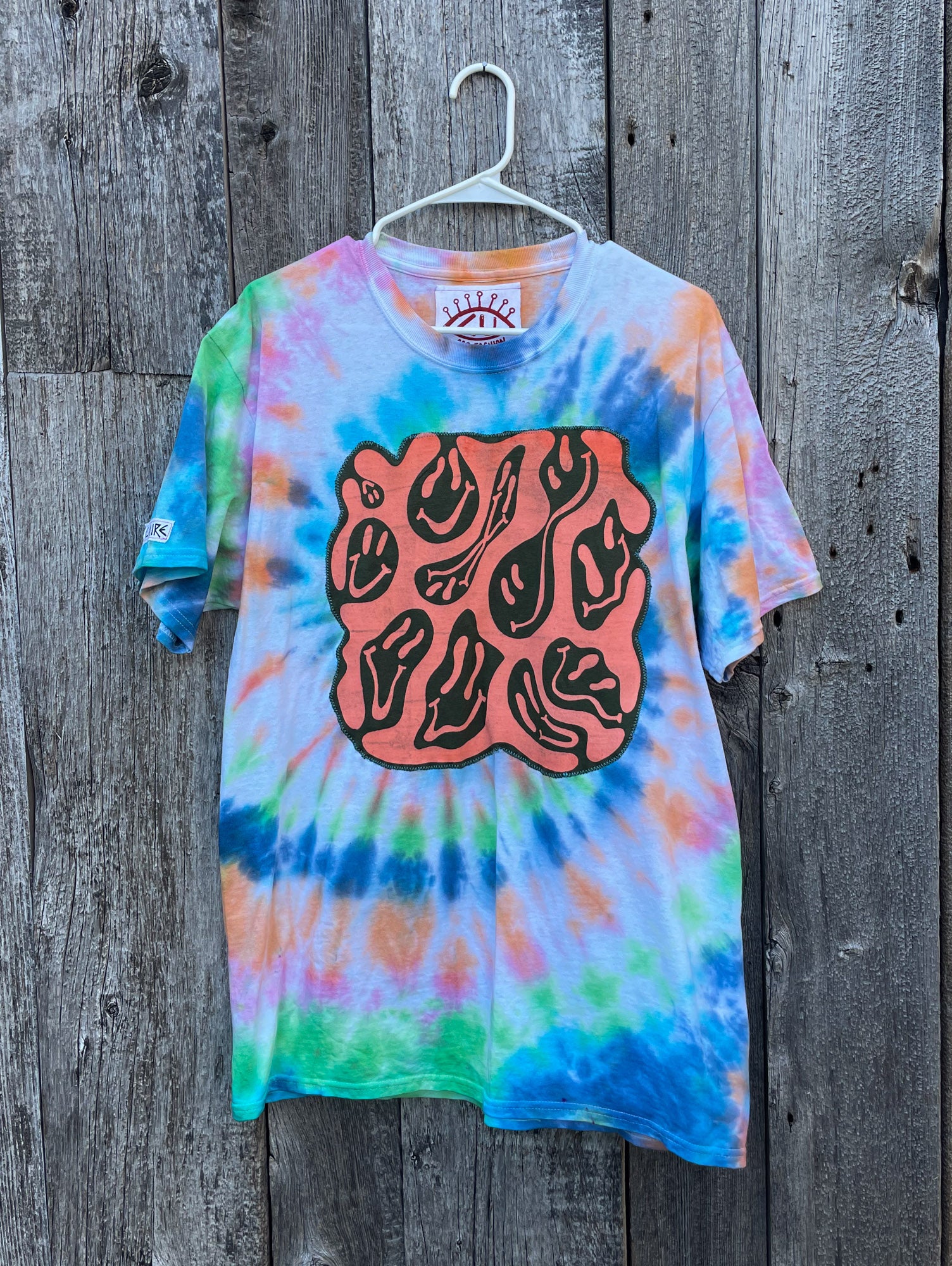 - Hand tie-dyed t-shirt with vivid sky blue, orange, pinks and greens