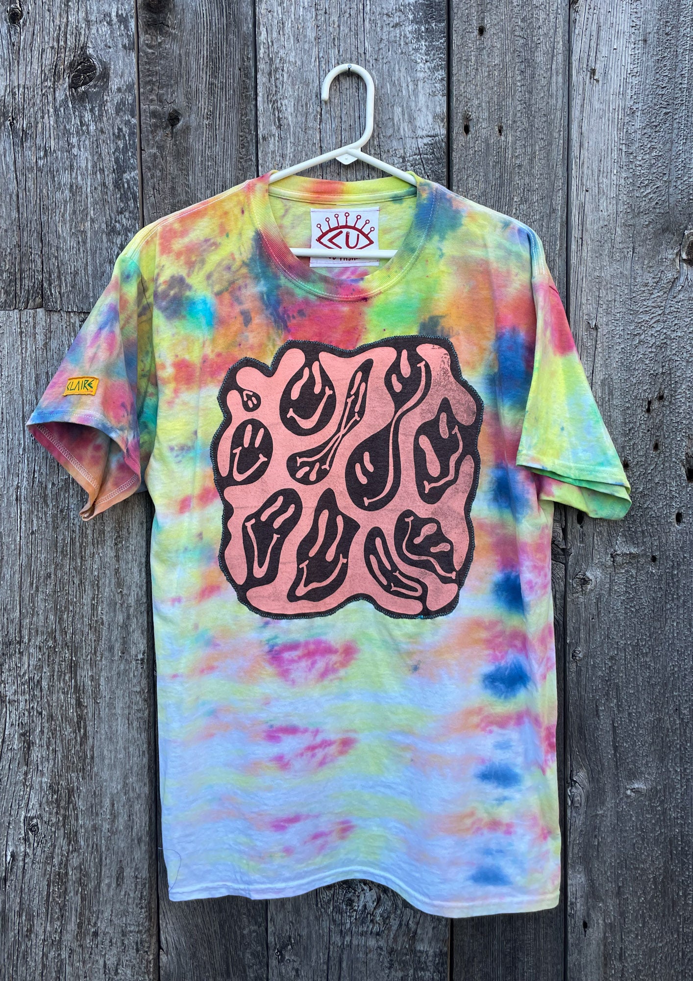 - Hand tie-dyed t-shirt with yellow, oranges, multi-colour rainbow style