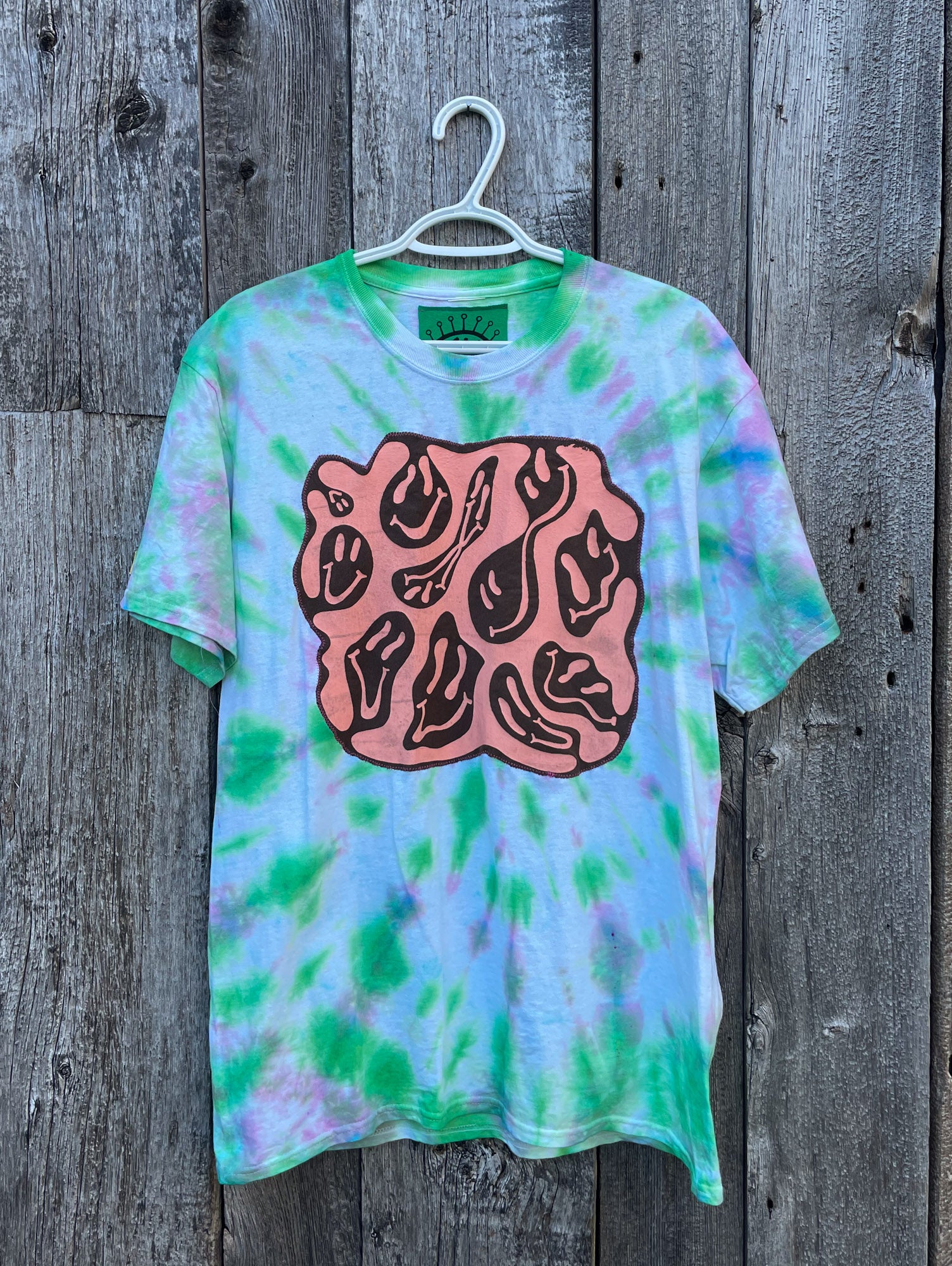 - Hand tie-dyed t-shirt with light blue fabric, green and pink colours