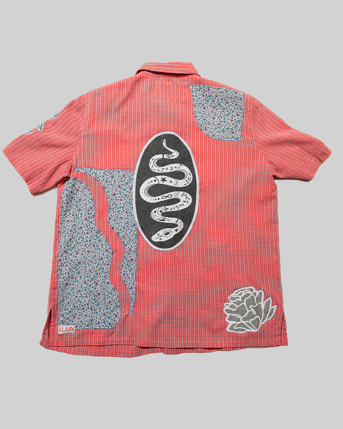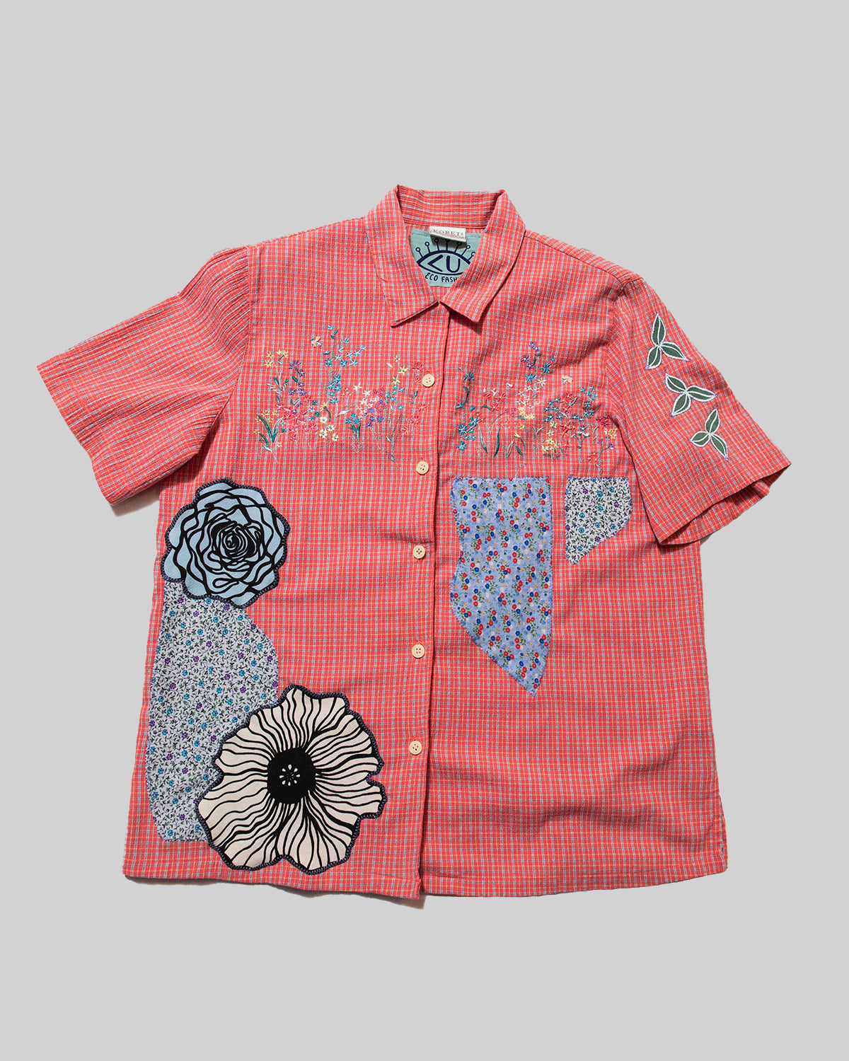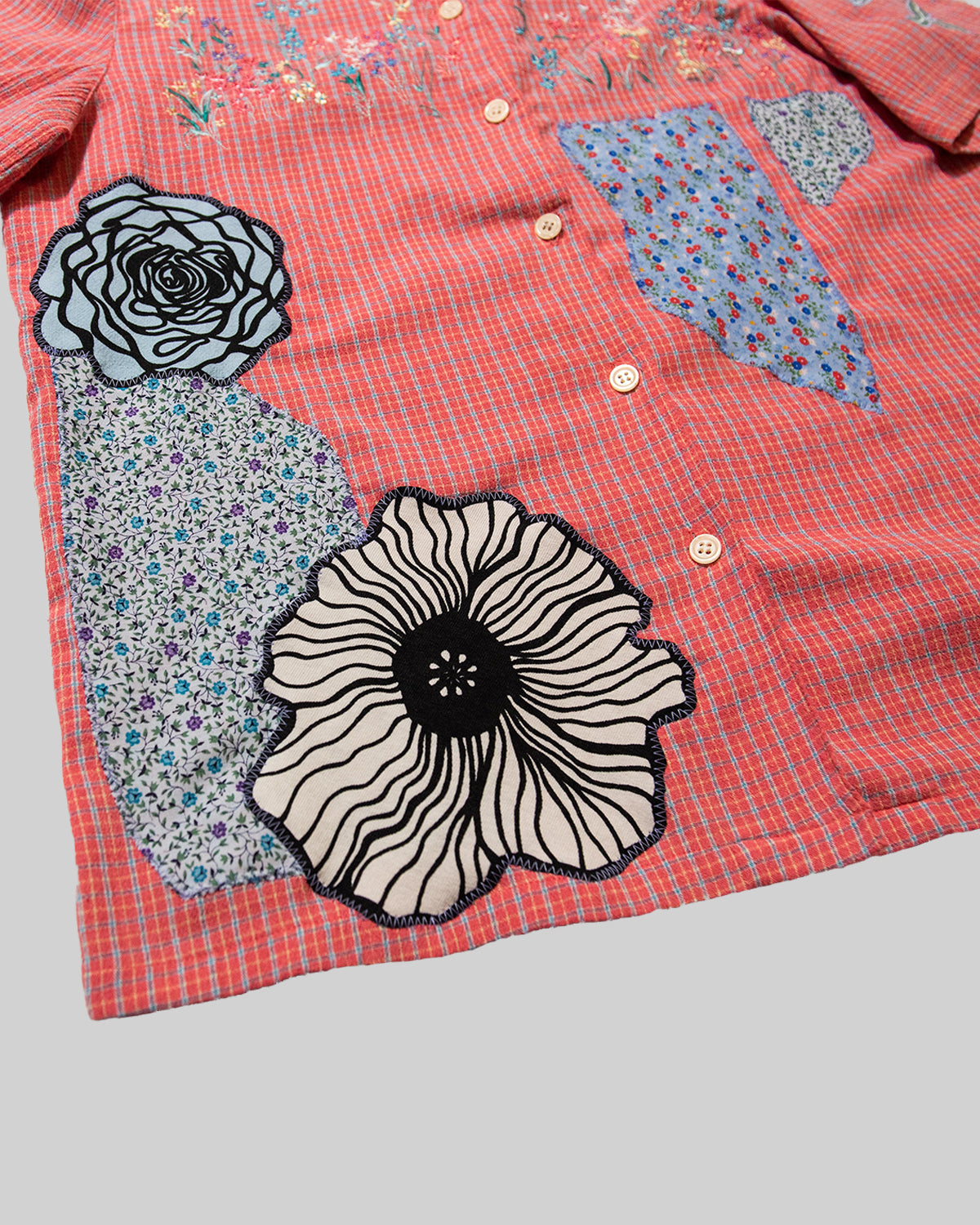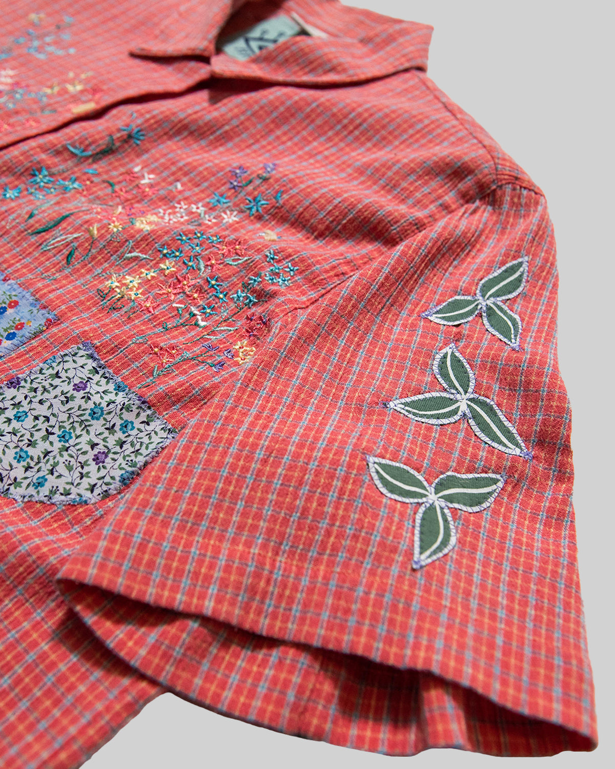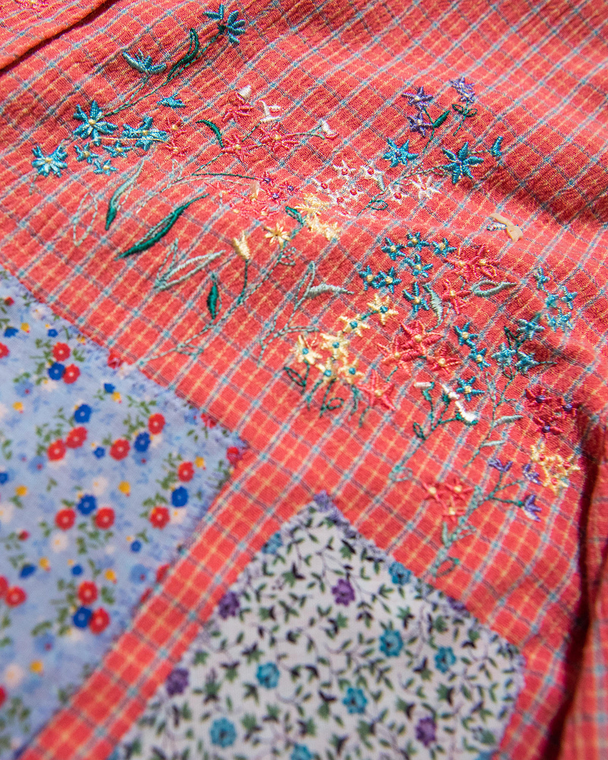 - Vintage plaid button-up with embroidered florals & shoulder pads